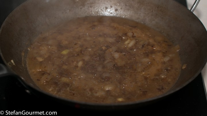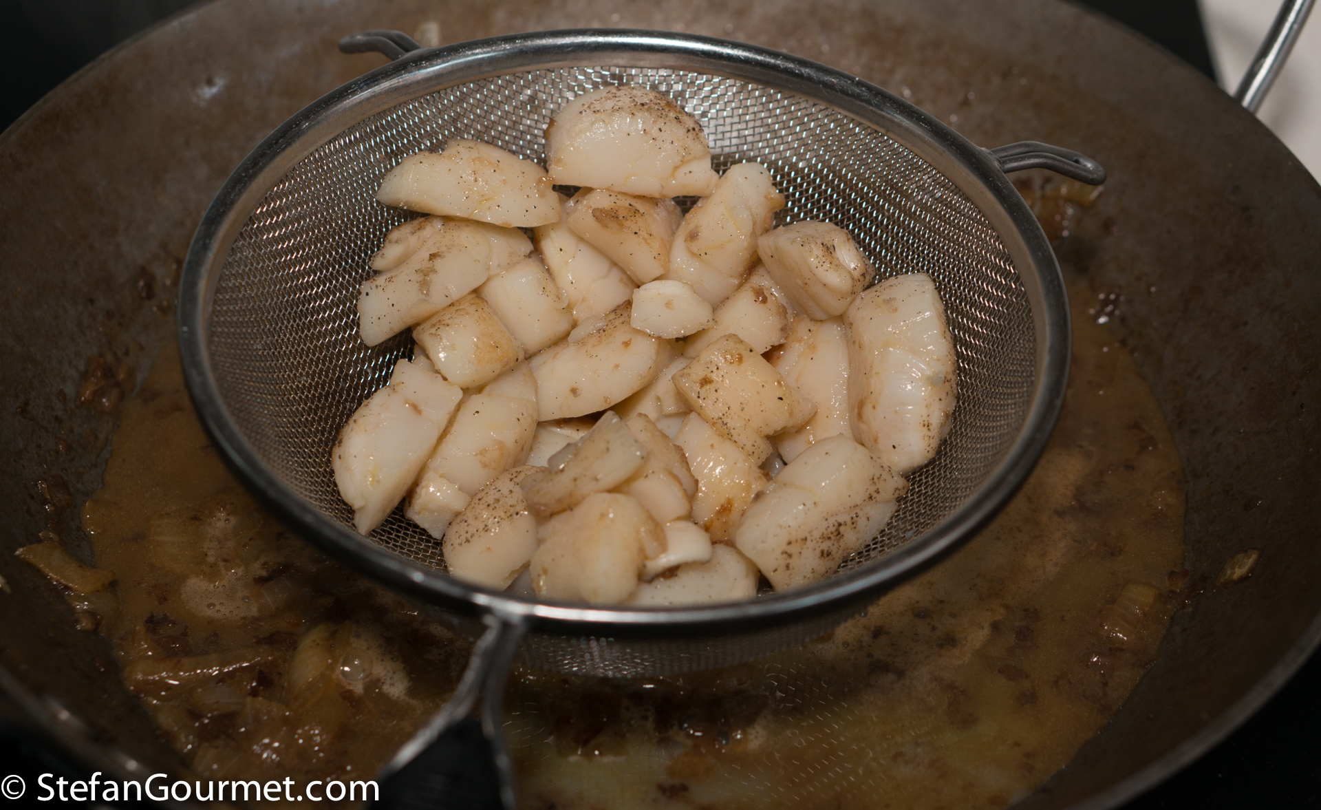 Stir the onions over medium heat, making sure to include any scallop bits that got stuck to the pan by scraping with a wooden spatula.