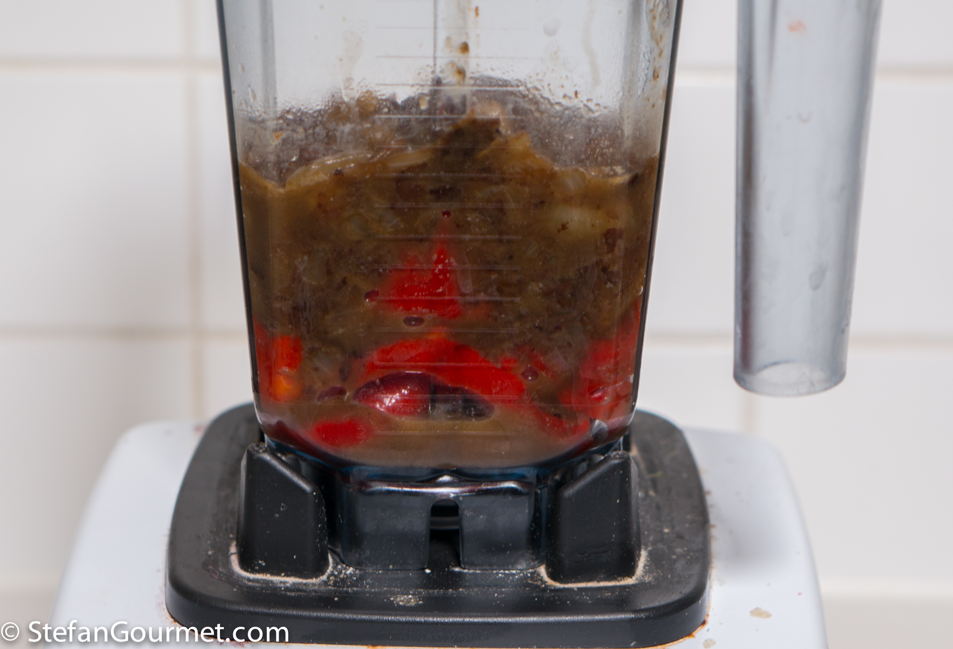 While the pasta cooks, put the now skinless bell peppers in the blender together with the onion sauce.