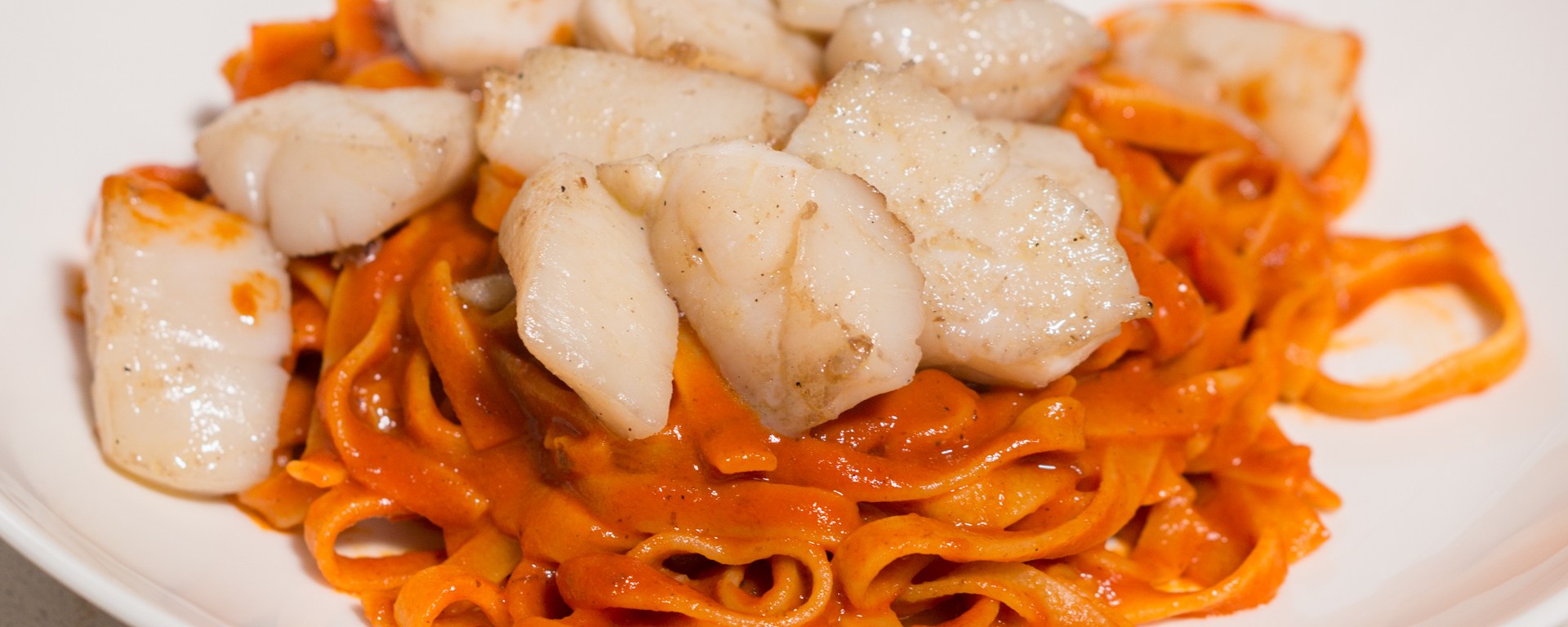 2 minutes before the pasta will be cooked, heat a tablespoon of olive oil in a frying pan (I wiped the one used for the scallops and onions with some kitchen paper) and sauté the scallops for a minute over high heat to heat them back up.