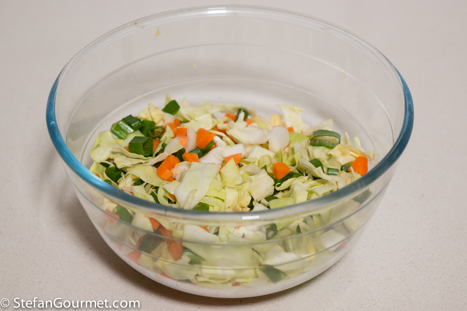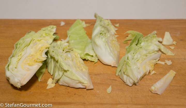 Cut the cabbage into wedges and remove the central trunk, then shred the cabbage.