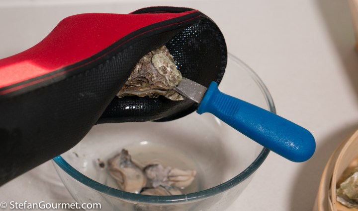 It should now be possible to open the oysters quite easily. Open them above a bowl to catch most of the water from inside the oysters.