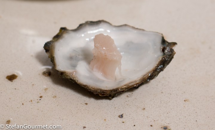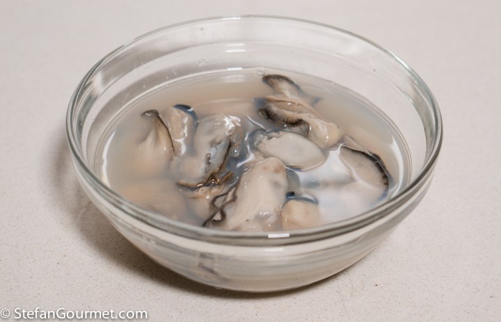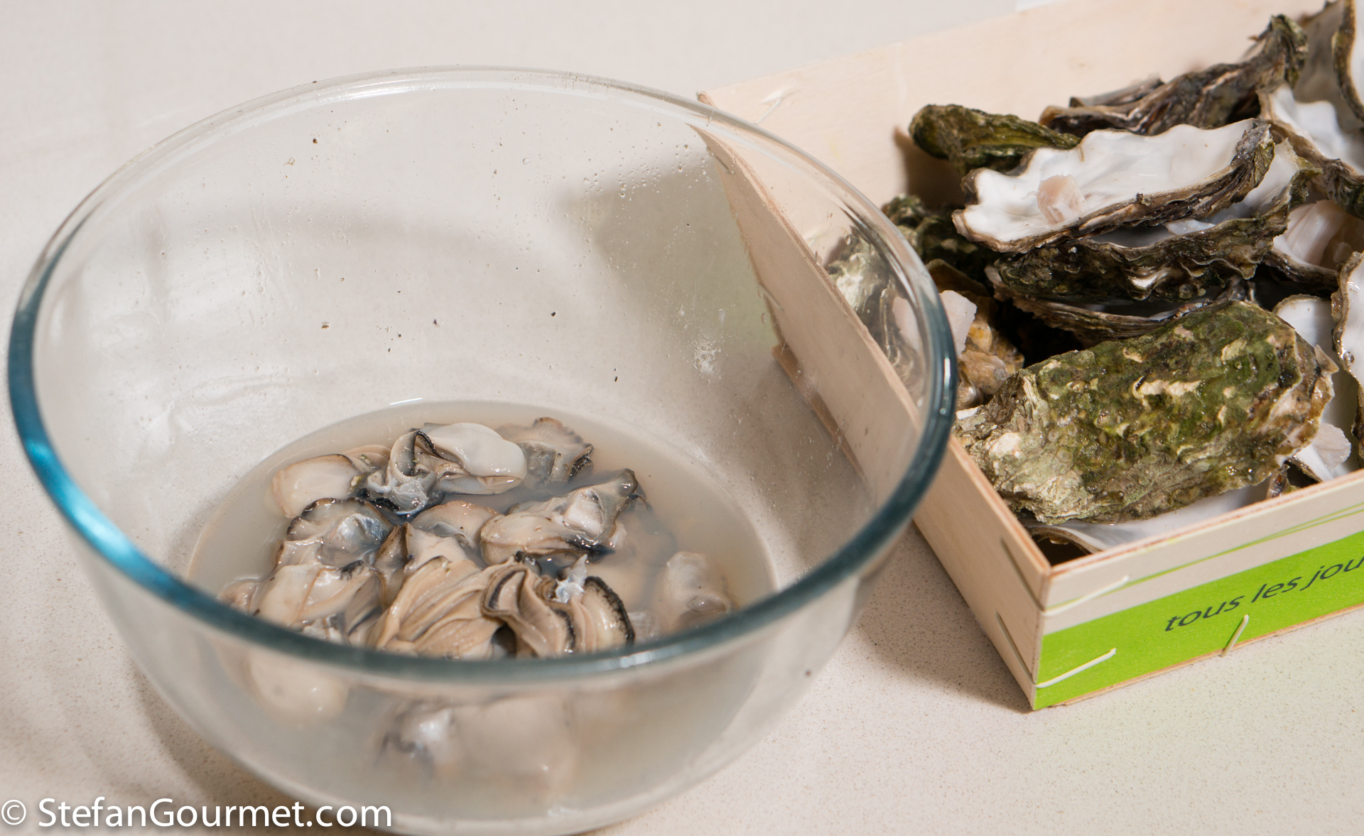 Take the oysters out of their shells, leaving the tough muscle behind. (This is the ‘scallop’ of the oyster, which is by now overcooked.)
