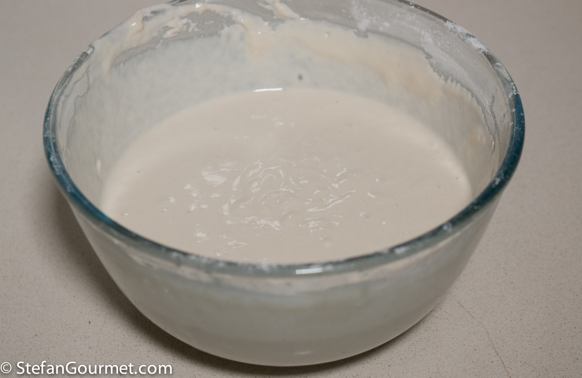 If using fresh oysters, add water to the oyster water to end up with 375 ml (1 1/2 cups). Sift the flour. Add the water, stirring well with a whisk to avoid lumps. If the batter is too thick, add more water. It should end up thicker than pancake batter. Add salt to the batter to taste. (You will need less salt if you used the oyster water.)