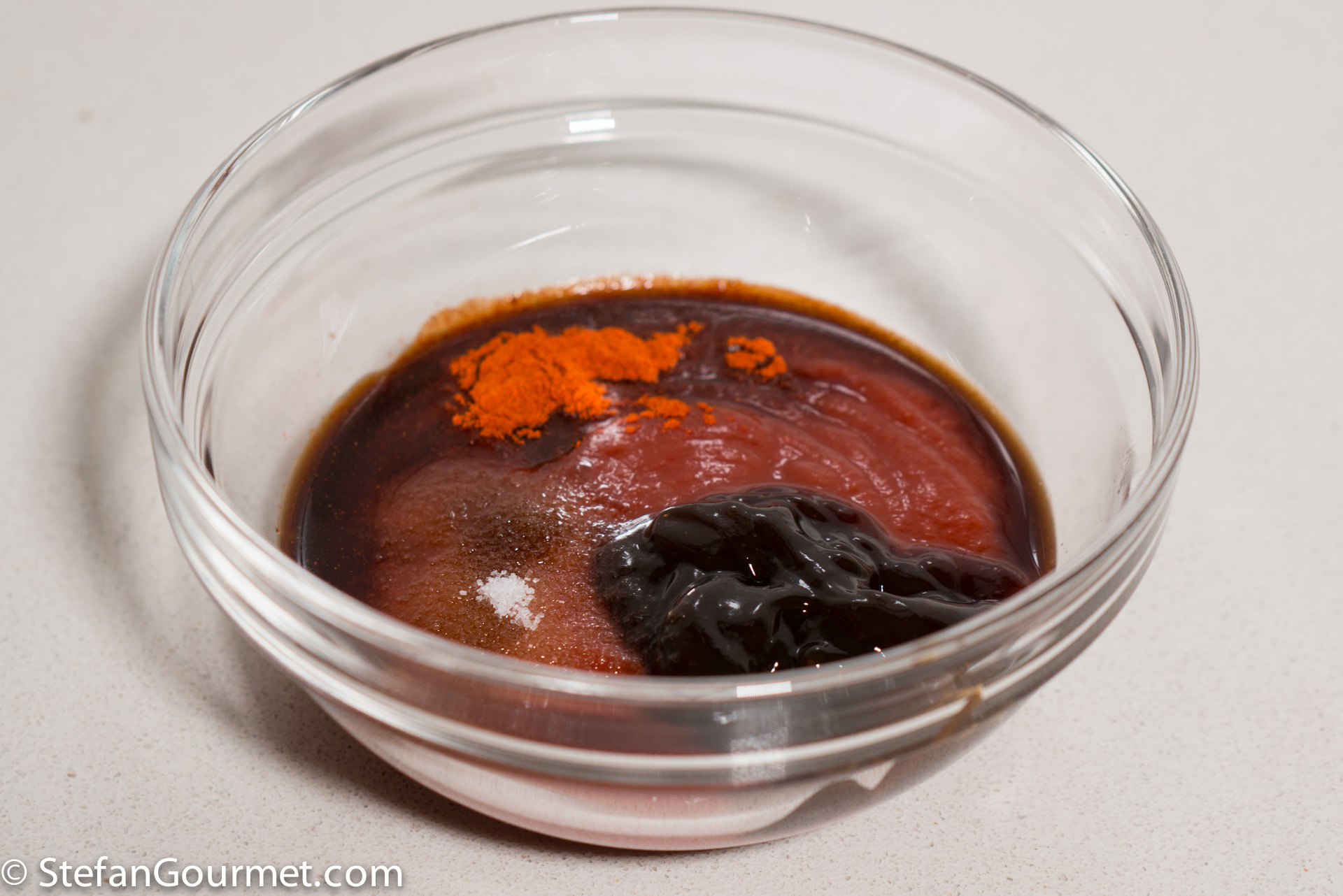 Make the sauce by combining the ingredients in a bowl and stirring well. If using sieved tomatoes they should be thick. If not, reduce them over medium heat first to get the thickness of ketchup.
