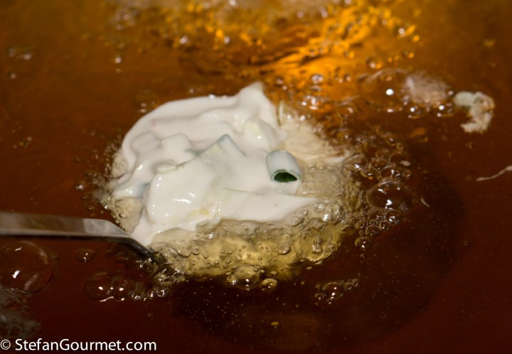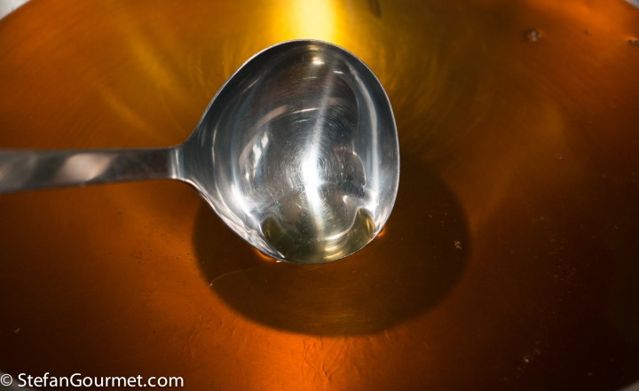 Now comes the tricky bit. Lower the ladle into the oil and allow it to cook for a bit. If the top has set, use another spoon to release the cake from the ladle.
