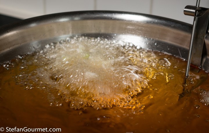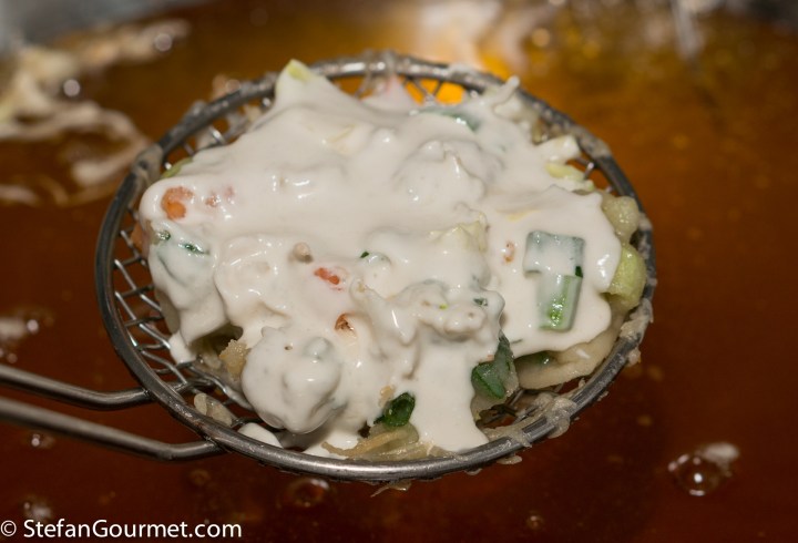 Put oil in a wok or use a deep fryer. Heat the oil to 160C/320F. (If you use a higher temperature, the cakes will disintegrate.) Lubricate a large ladle by dipping it into the oil.