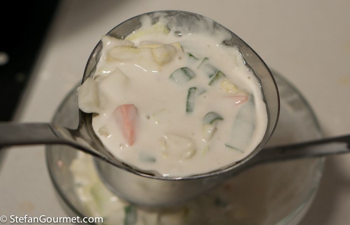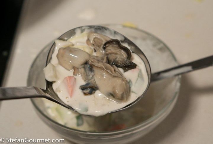 Sometimes also shrimp is included. The technique of making them is to build up the cake in a large ladle. I did not ask for a recipe (and the women making these did not speak English anyway), but as I watched how they were made I was pretty sure I could replicate them at home. It was a success, although it is clear that these women have been doing this for a while, and my oyster cakes do not look as nice as theirs. Not yet, anyway.