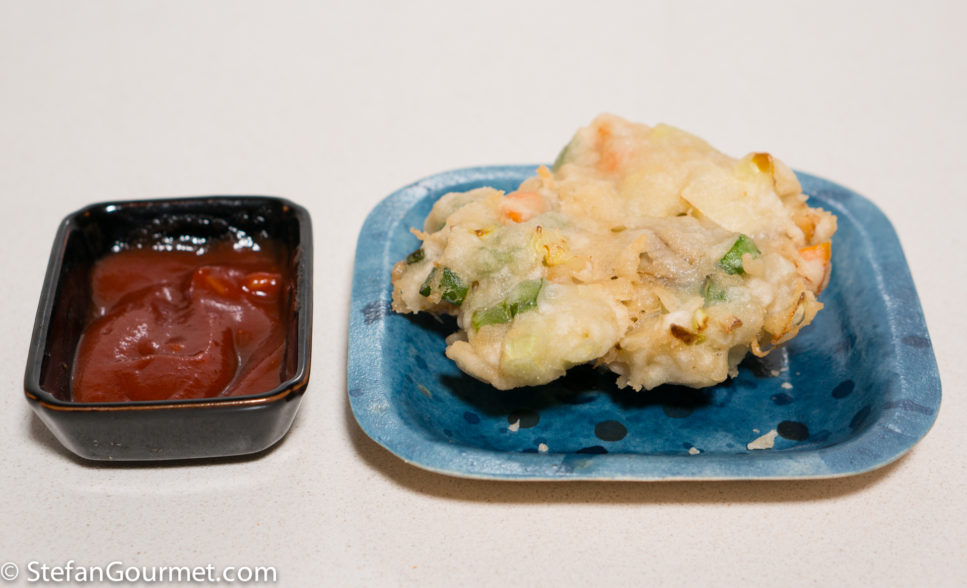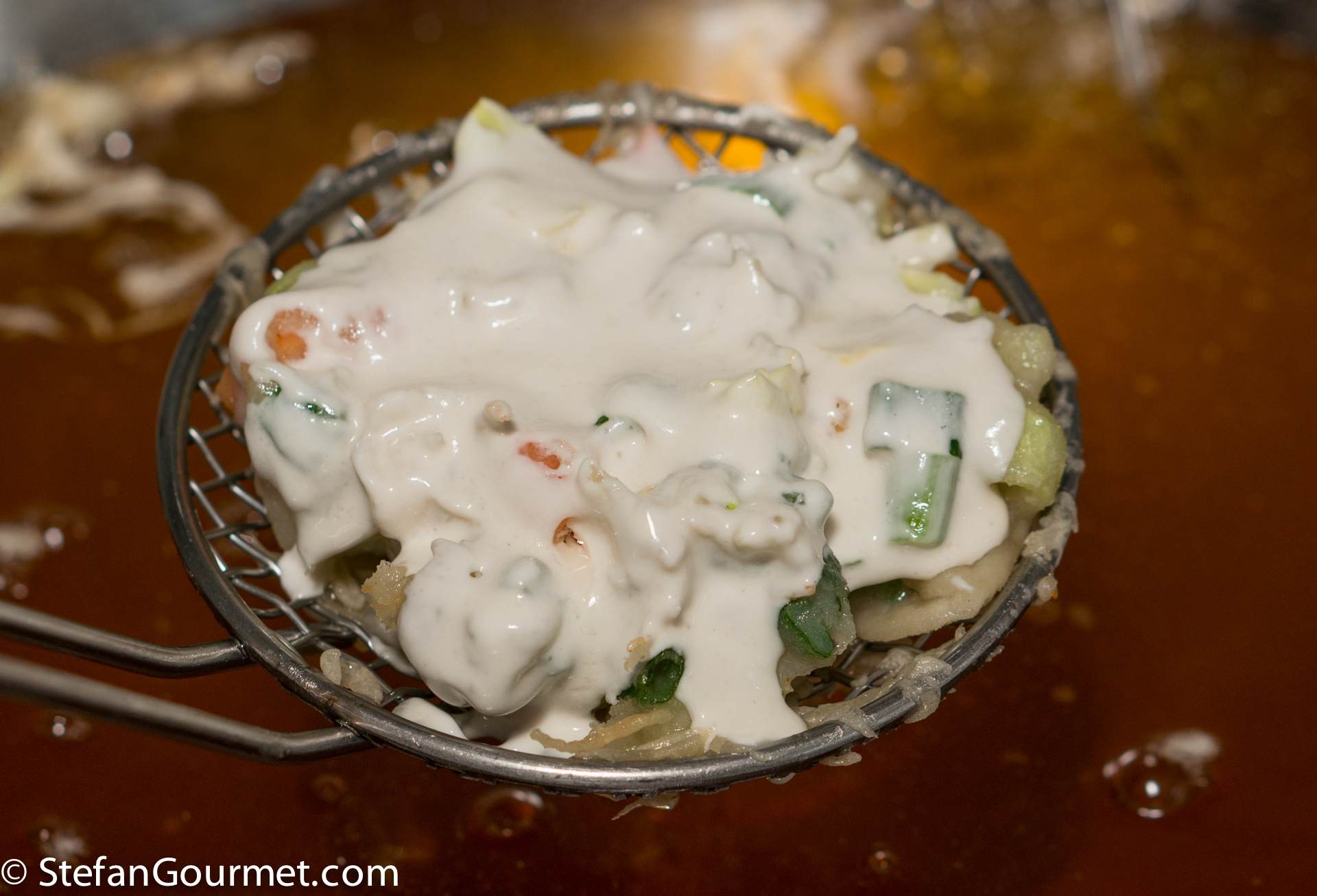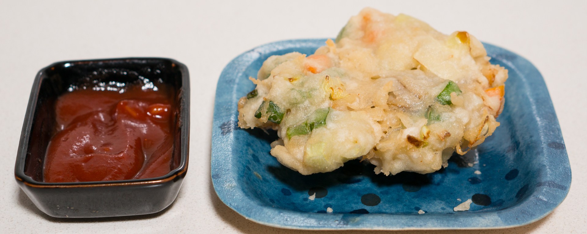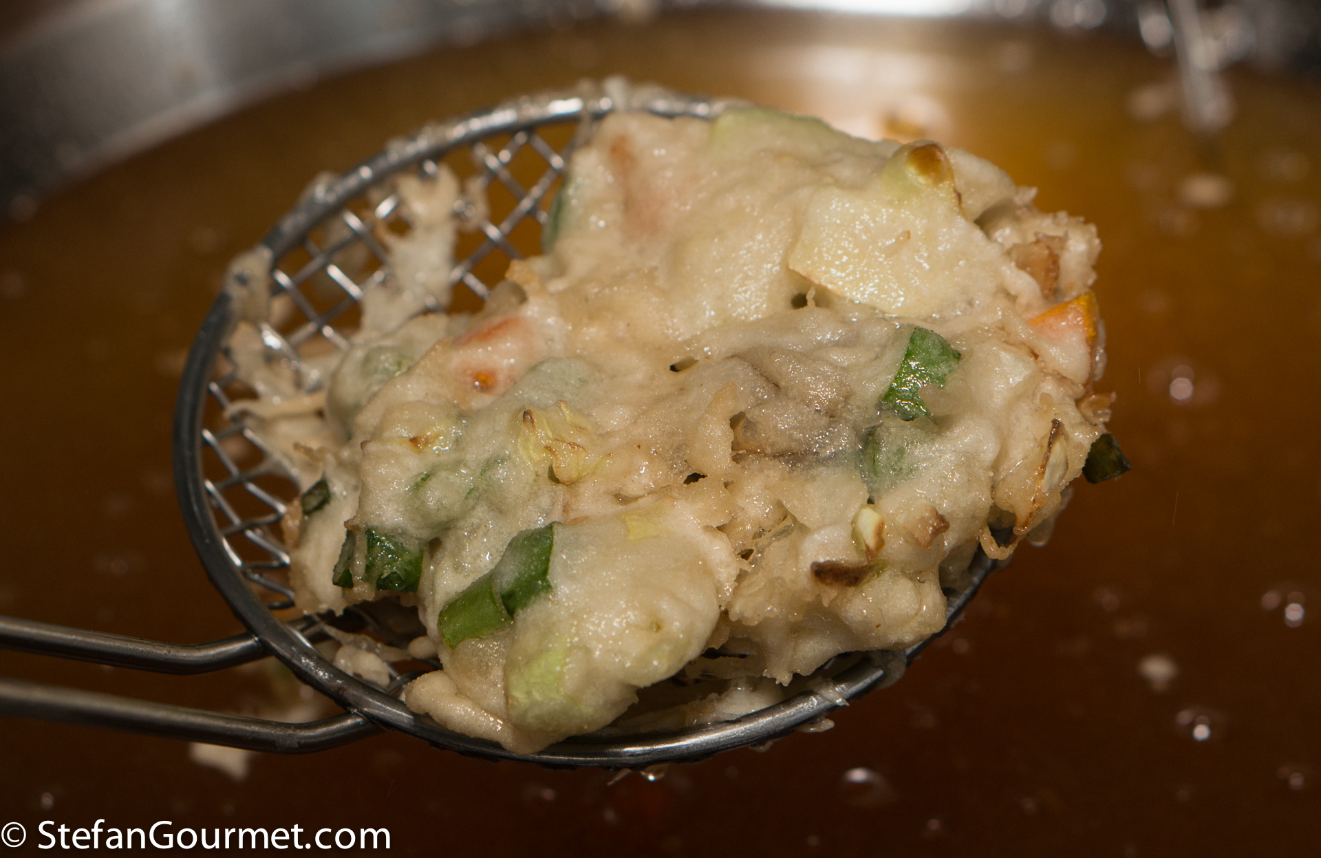…add some of the reserved batter (from the half without vegetables) and return it to the hot oil. Deep fry until the cake is golden on the outside and cooked through on the inside.