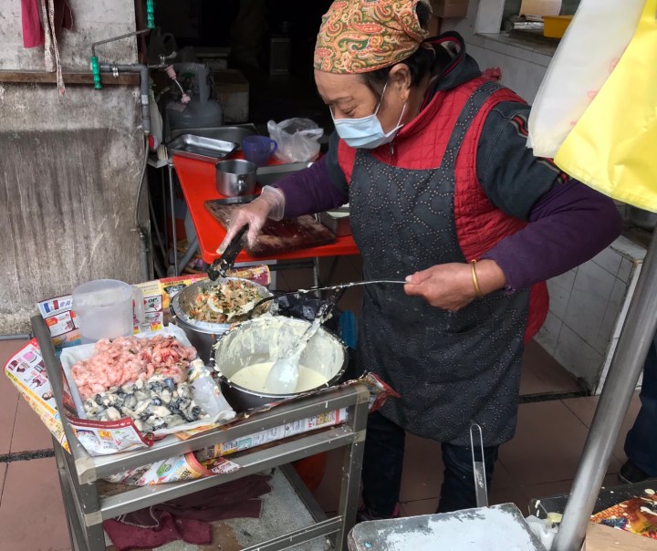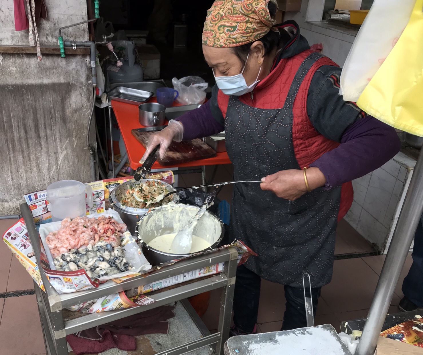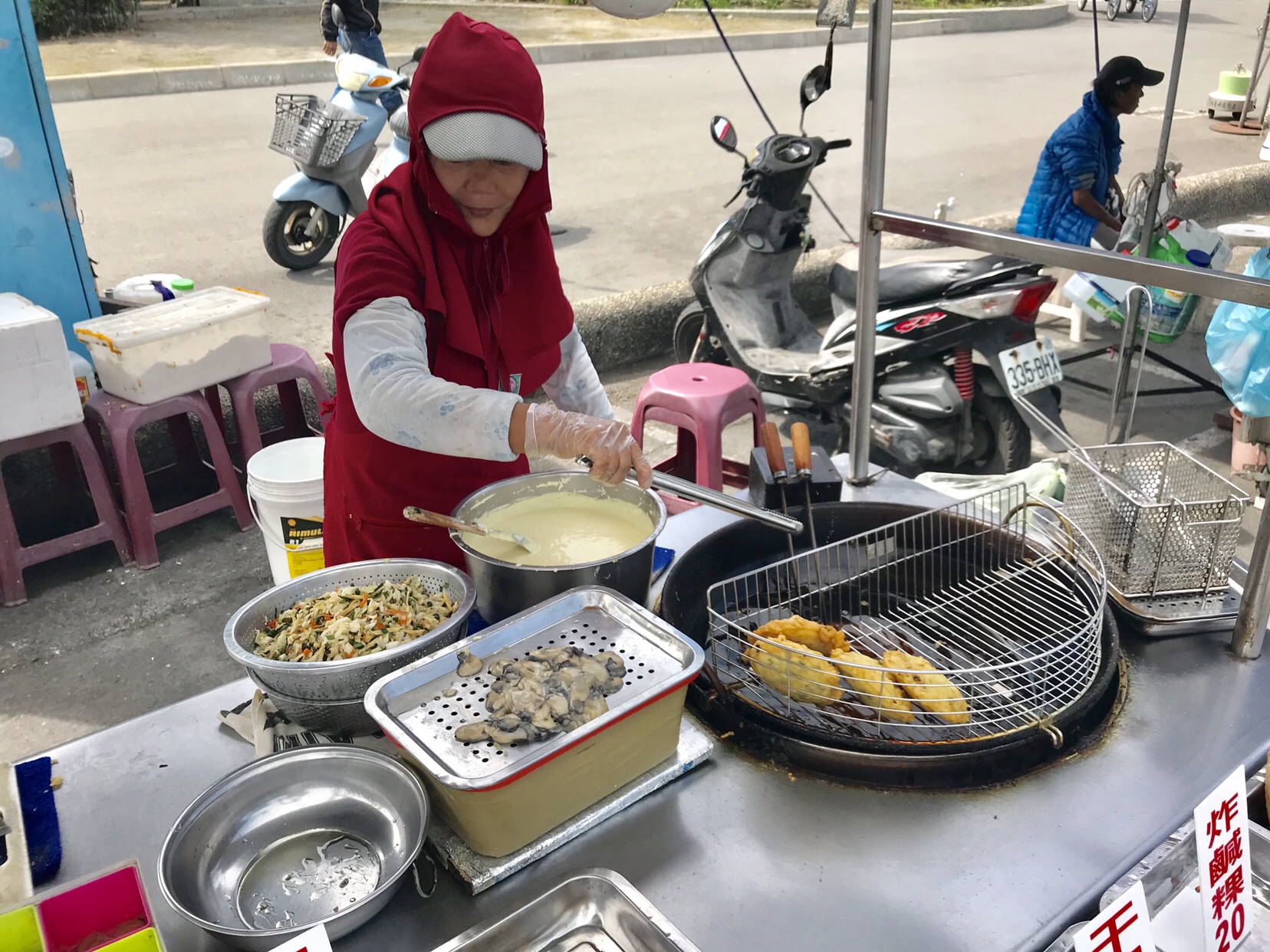 We really loved the street food in Taiwan. On the island of Cijin that is part of the harbor city of Kaohsiung, we had very tasty oyster cakes. You could also call them fritters, because the oysters are deep fried in a batter along with cabbage, carrot, and scallions.