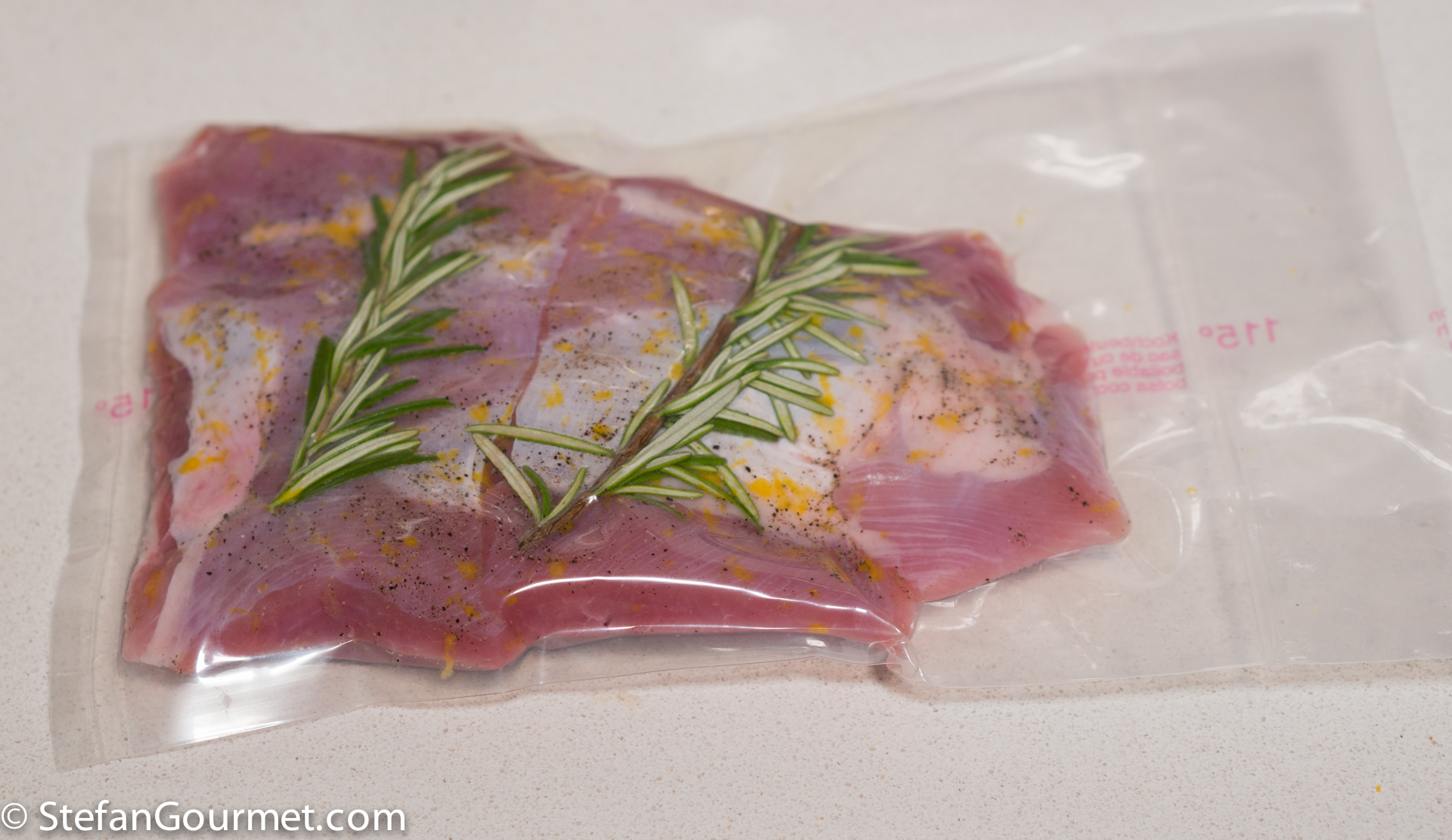 When I saw boneless and skinless turkey thigh at my poultry guy at the market, I wanted to give it a try and of course I wanted to prepare it sous-vide. The combination with lemon and rosemary was inspired by Italian recipes. Since I wanted the turkey to be tender and juicy, I decided to cook it sous-vide for 24 hours at 62C/144F. The result was very good. You could apply the same time and temperature for a whole leg or a drumstick. Here is what I did…
