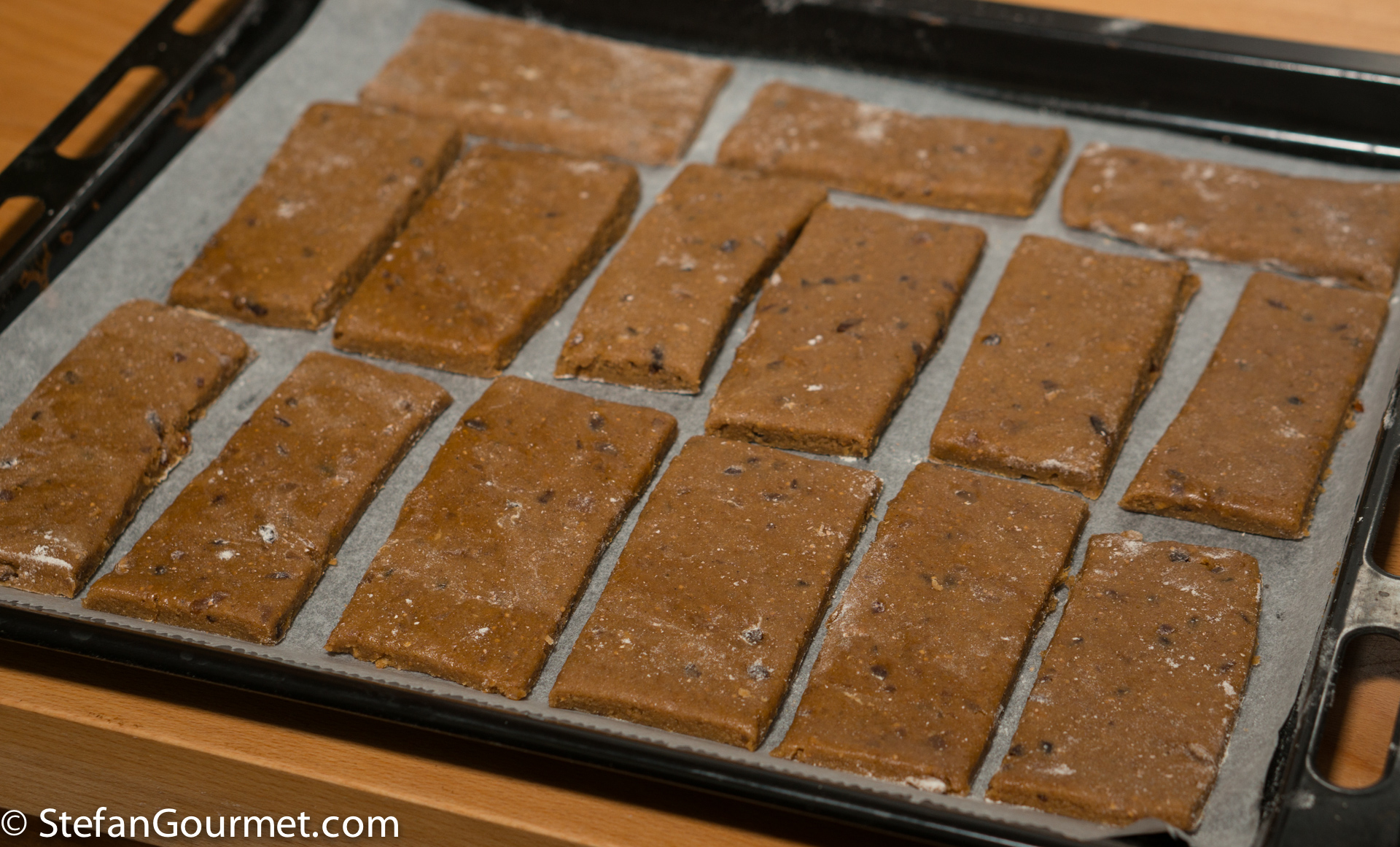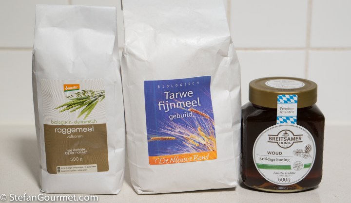 The original German recipe calls for the old-fashioned rising agents Pottasche (potassium carbonate) and Hirschhornsalz (ammonium carbonate), which I replaced with baking powder. Two types of flour are used: wheat flour type “1050” (in Dutch: gebuilde bloem) and rye flour type “1150”. These are also old-fashioned types of flour, from which the germ and bran have not been sieved as carefully as from today’s all-purpose flour. To approximate this, you can mix equal parts of all-purpose flour and wholewheat flour.