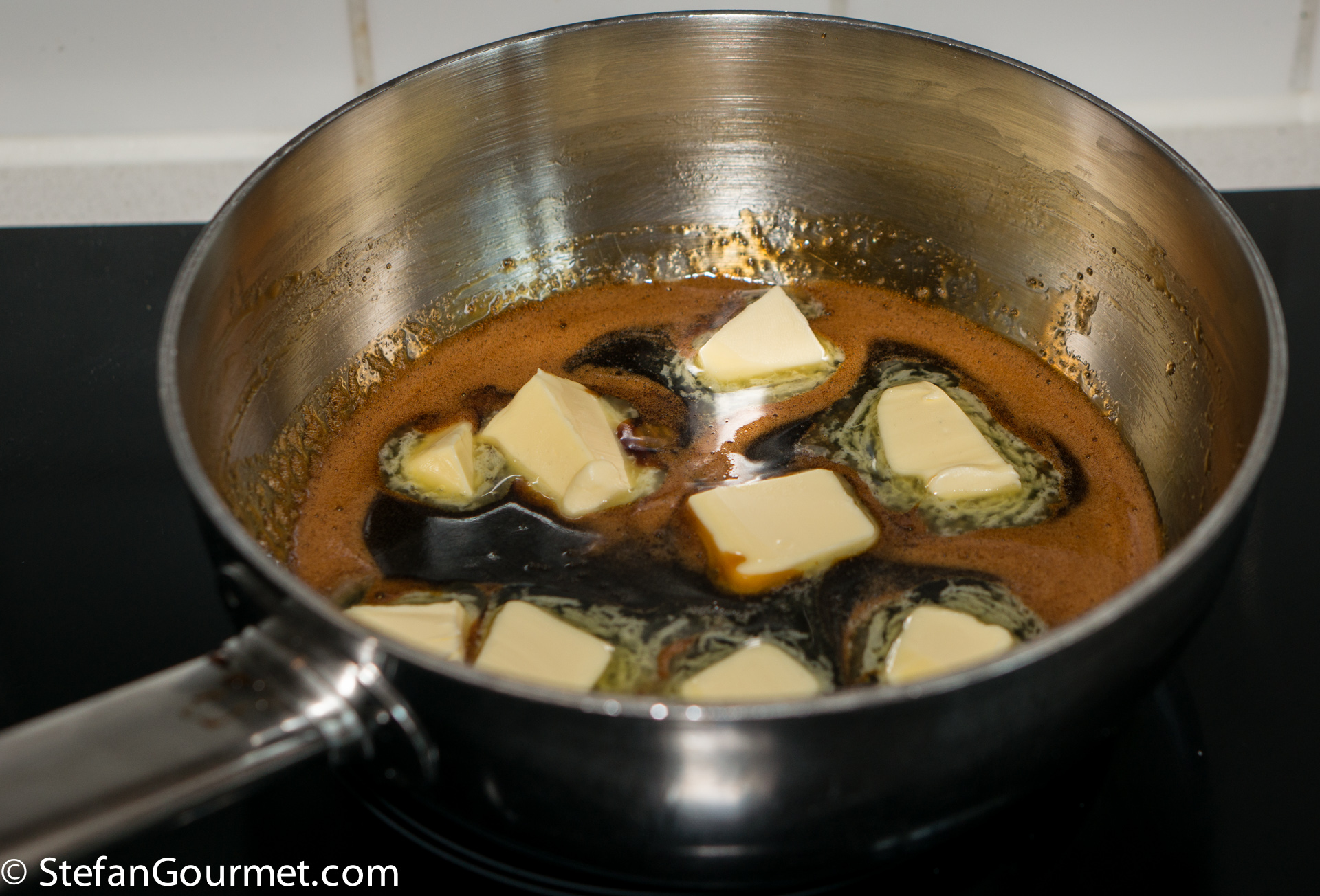 Cook, stirring, until the sugar has dissolved. Then turn off the heat and add the butter.