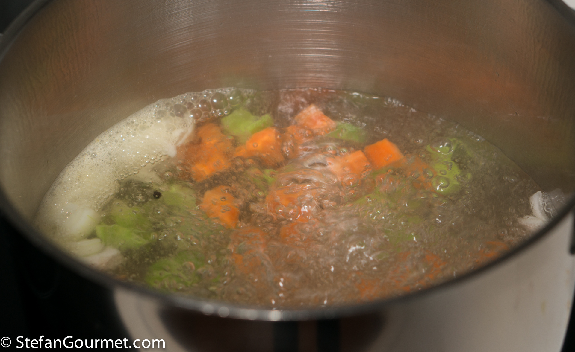 Put about 4 litres (4 quarts) of water in a large pot with chopped onion, celery, and carrot, as well as the peppercorns and bay leaf. Bring this to a boil.