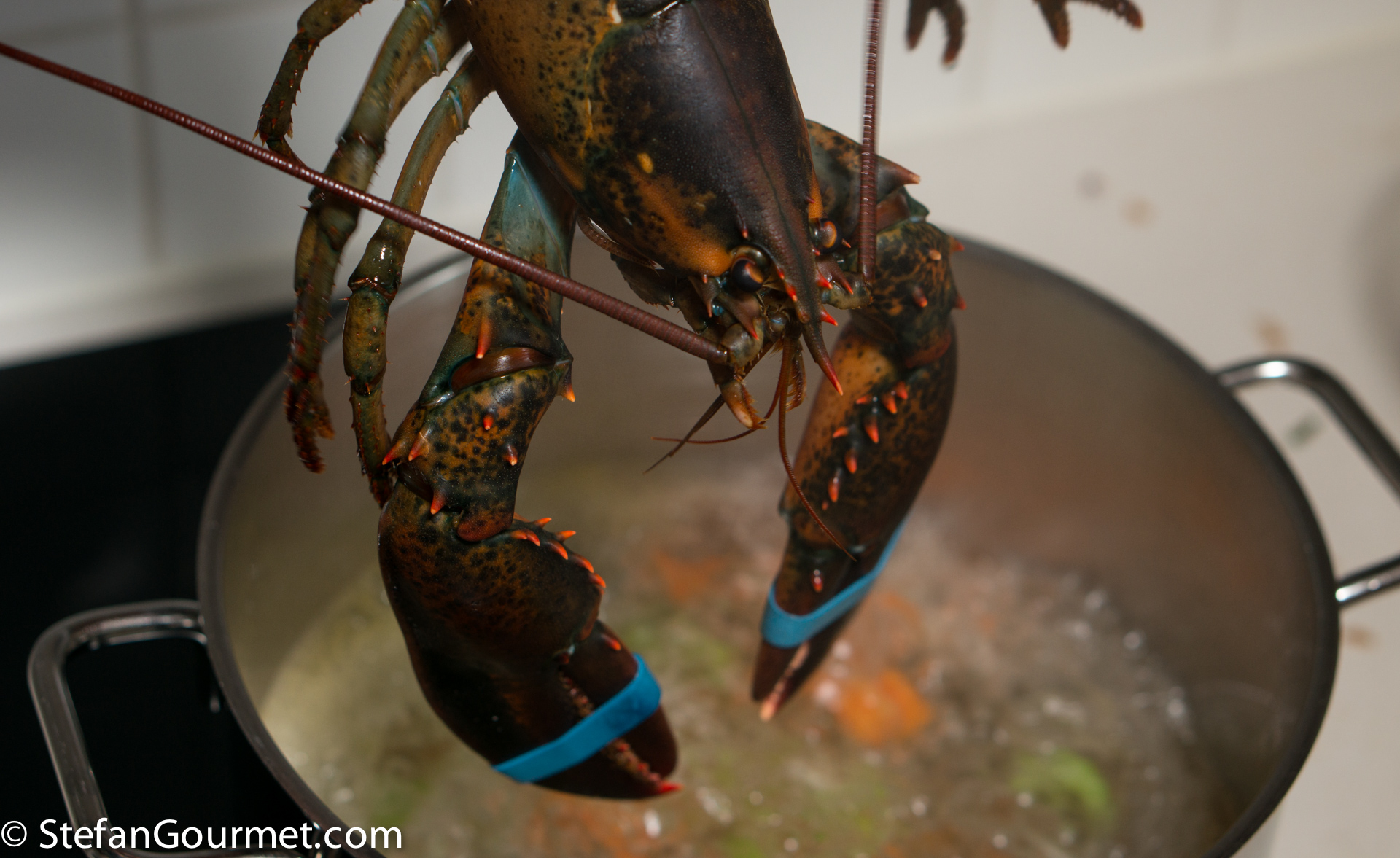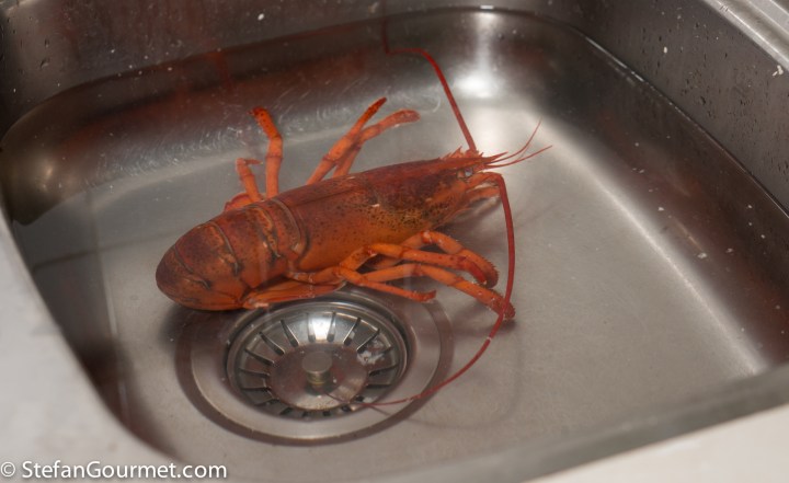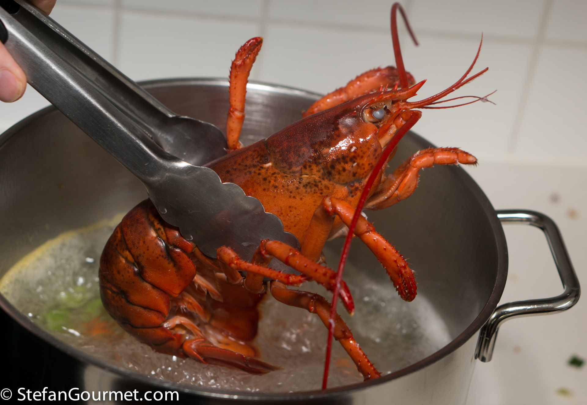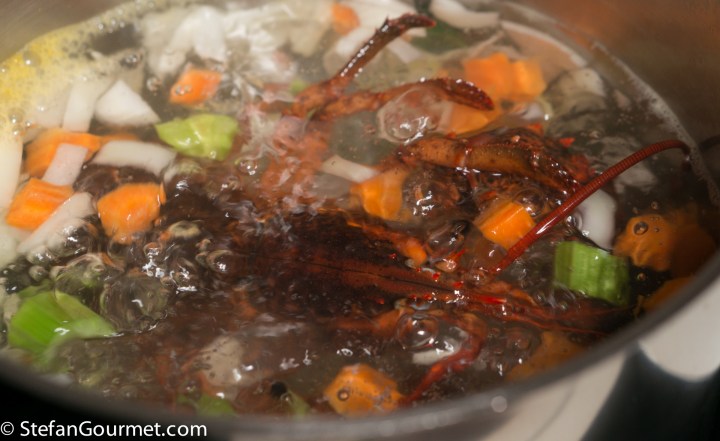 When the water has reached a rolling boil, keep the heat high and add the lobster, head first, so it will be killed instantly. If you prefer you could kill the lobster with a large knife first.