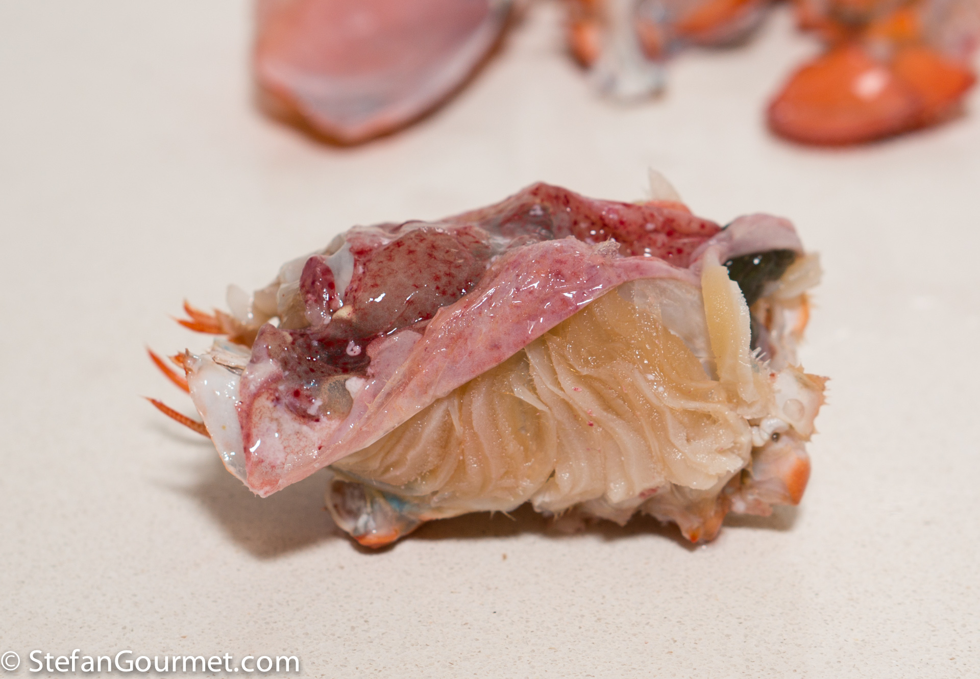 Remove the inside of the body and discard. (The gills will give a bitter taste to the sauce. If you like you can extract the tomalley and use it in the filling, but it does have a very strong flavor.)