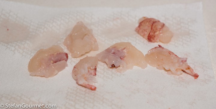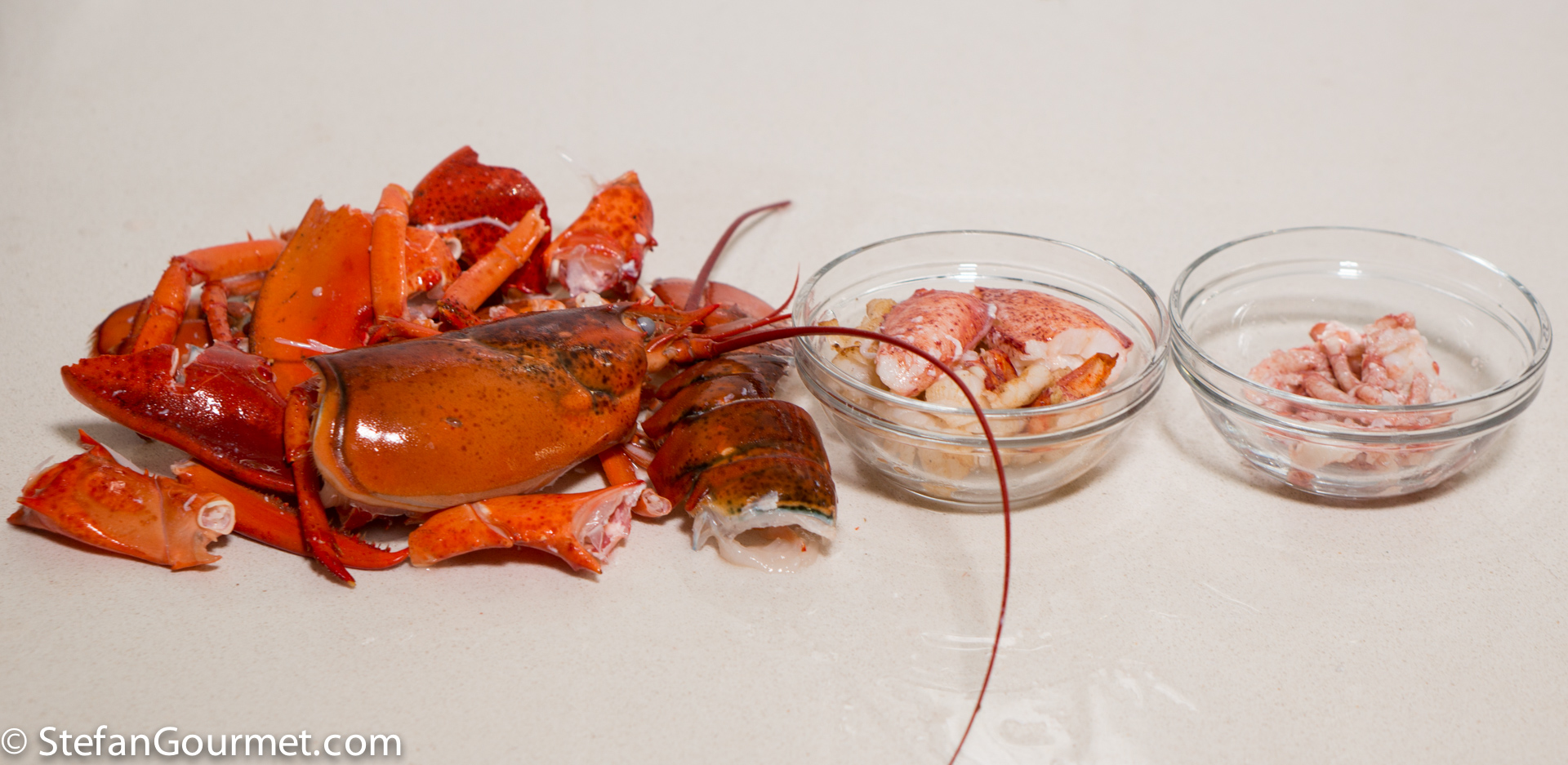 Sort the meat into two categories. The ‘nice’ meat is the butter sauteed meat from the tail and the firm meat from the claws (but not the softer tips). The legs, knuckles and soft tips of the claws are the ‘less nice’ meat.
