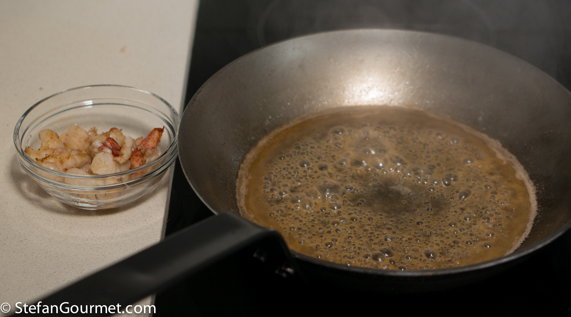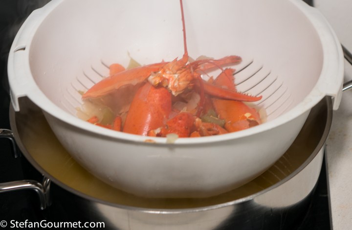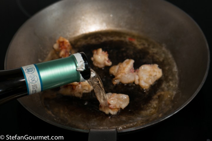 Take the lobster meat out of the pan and reserve. Reduce the wine to about a tablespoon, stirring regularly.