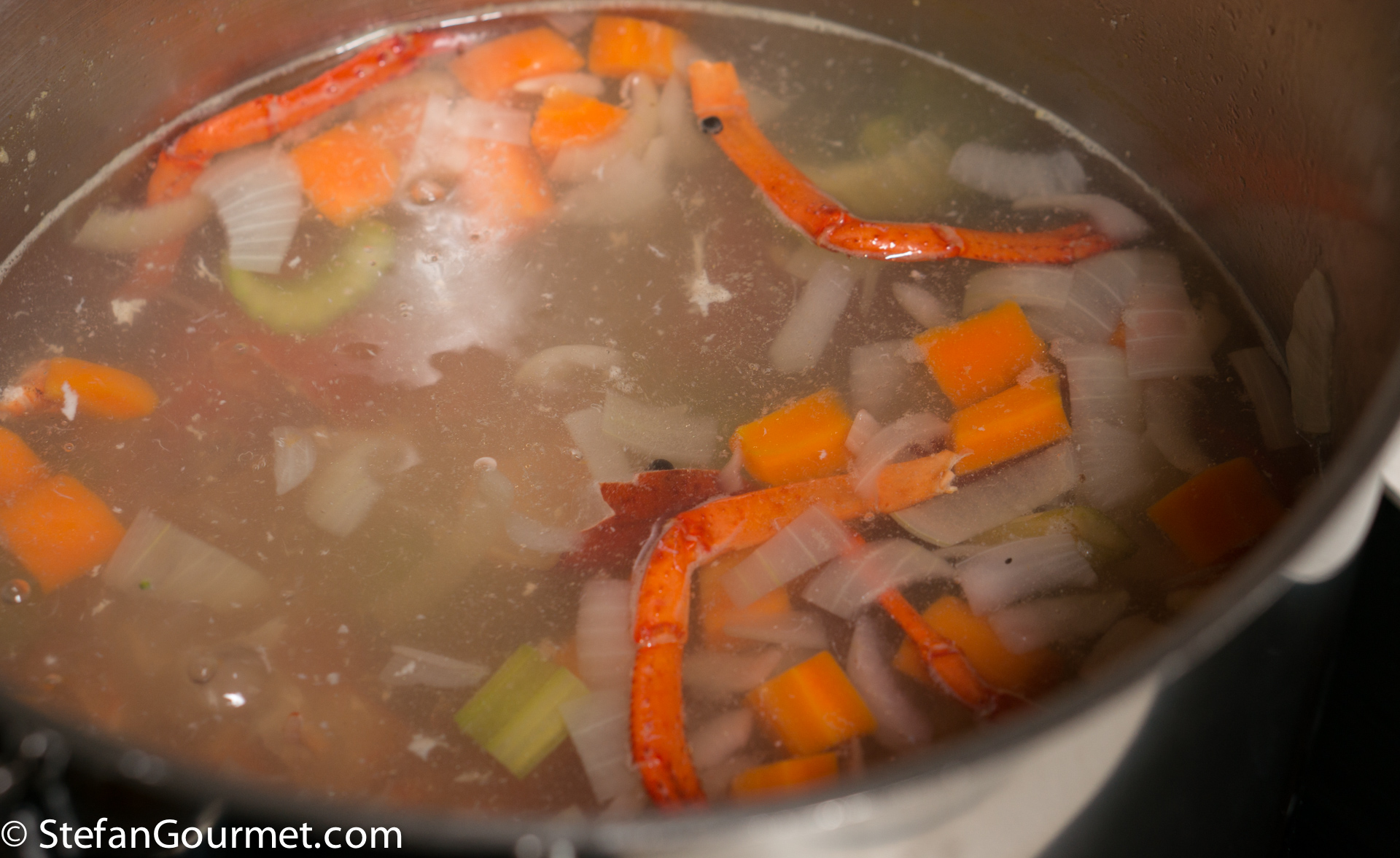 Add all of the shells to the stock. Bring to a boil, then simmer for 30 minutes to extract the lobster flavor.