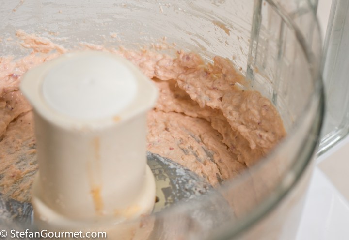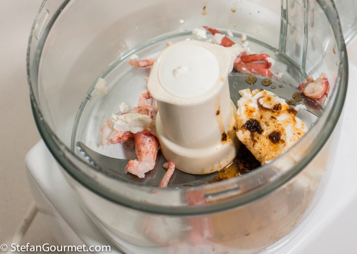 Put the ‘less nice’ lobster meat in a blender or food processor together with the reduced wine and butter mixture plus the ricotta.