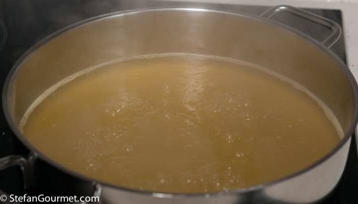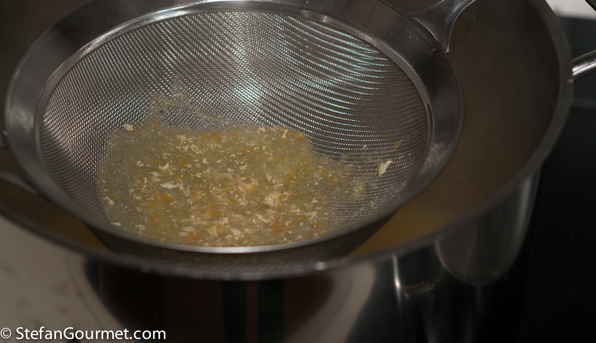 After the stock has simmered for half an hour, strain the solid parts out. First with a colander…