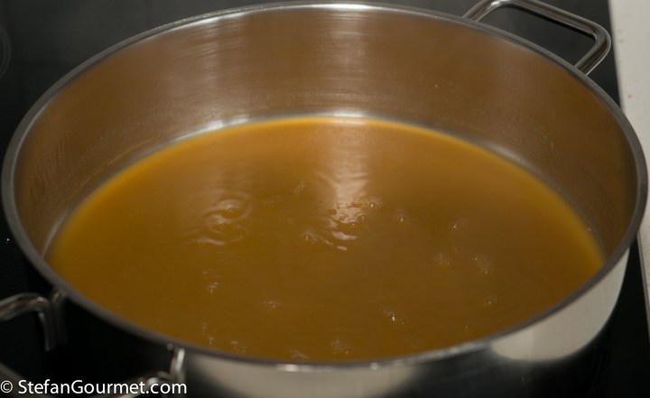 Reduce over medium heat, stirring regulary, until it is quite thick (about 100 ml or half a cup).