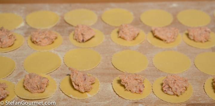 Make fresh pasta dough with 2 eggs. Roll it out to the thinnest setting. In this case I wanted to make pretty ravioli so I used a small round cookie cutter to cut circles out of the pasta dough. I put about a teaspoon of filling on half of the circles.