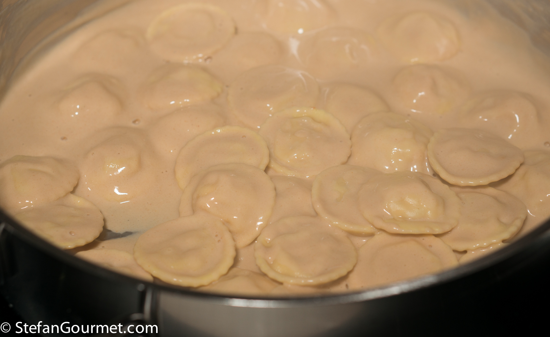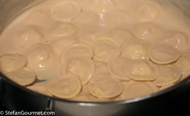 When you have transferred all of the ravioli to the bisque, very gently toss them to coat them with the sauce.