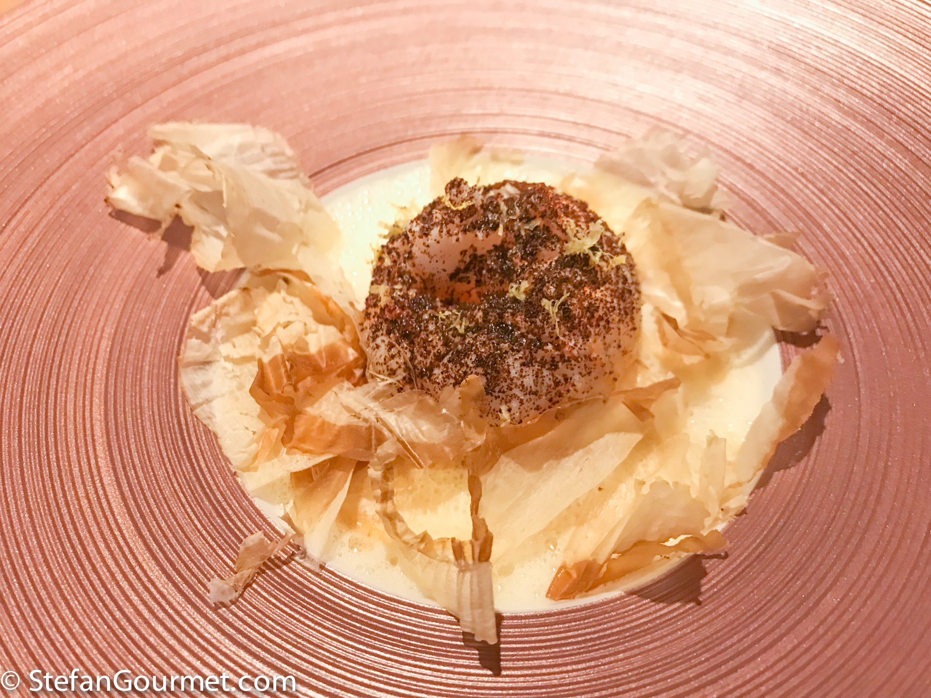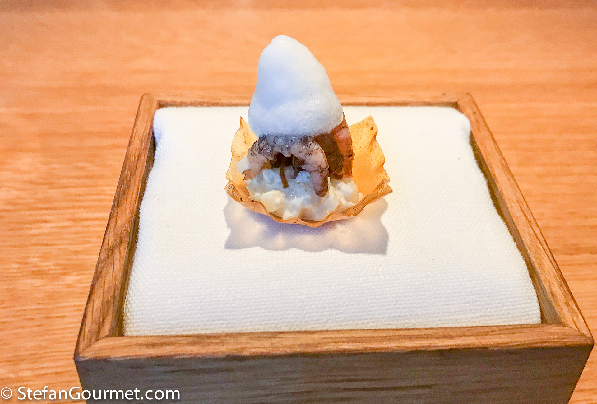 Third course: langoustine (scampi) poached in duck-fat with Dashi Albufera, coffee and katsuobushi (Japanese grated dried and smoked bonito). What a great and original dish. The texture of the langoustine was absolutely perfect and the flavor combinations just wonderful. 10/10