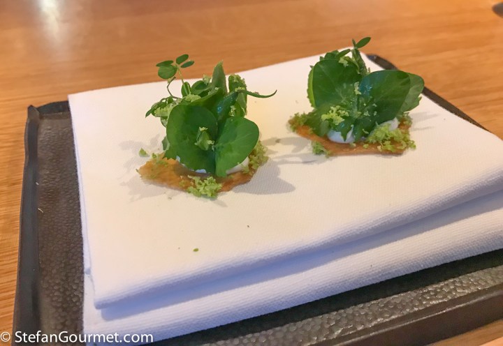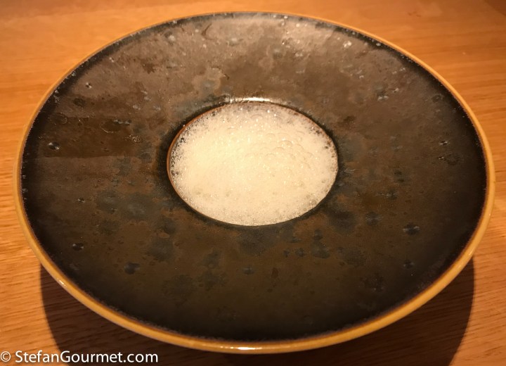 The first course of the tasting menu: ‘crumble’ of sea bass with smoky stock and seaweed. The smoky stock is made by smoking the bones of the sea bass before using them for the stock. The crumble is actually a ceviche made using passion fruit juice.