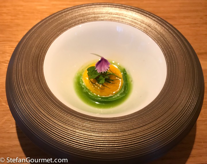 Or this one with runner beans, egg yolk confit, and crab, with a crab bisque inserted into the egg yolk.