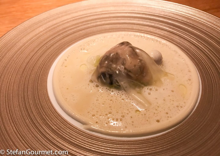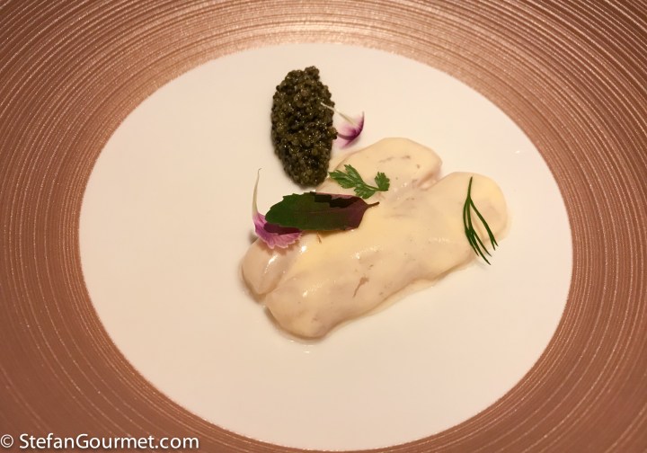 The second course: open ravioli of oyster with briny veal shank velouté, hazelnut, BBQ lemon confiture, and green cabbage. The oyster wasn’t cooked but just barely warm. What a great combination of flavors, such complexity and elegance. Here we opted for the premium, a Chablis Grand Cru, that paired very well. 10/10