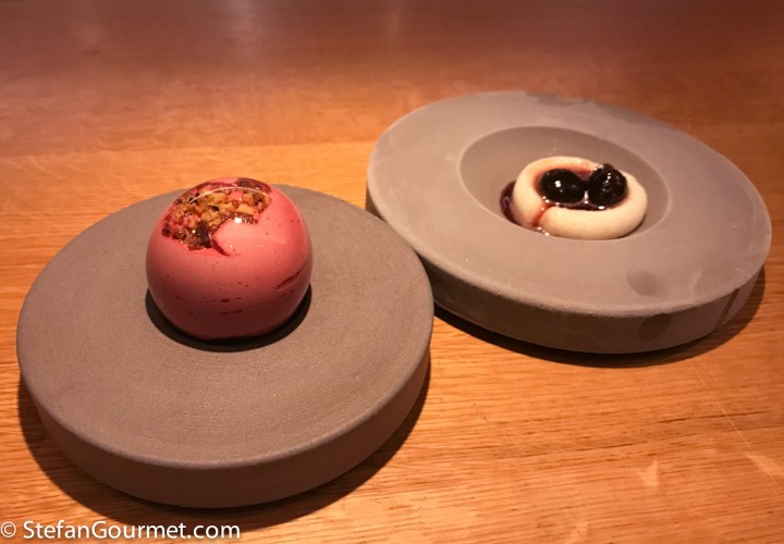 The seventh and final course was an outstanding cherry dessert. The cherries you see on the right-hand side are reconstructed cherries. They look like amarena cherries and they taste like amarena cherries and they are made from amarena cherries, but their texture is amazingly soft. The other part with smokey bourbon, lemon, cherry-umeboshi foam, black olive, and crispy walnut was also amazing. This was paired well with an Auslese made from Zweigelt from Austria, that was just sweet enough and really brought out the cherry flavors. 10/10