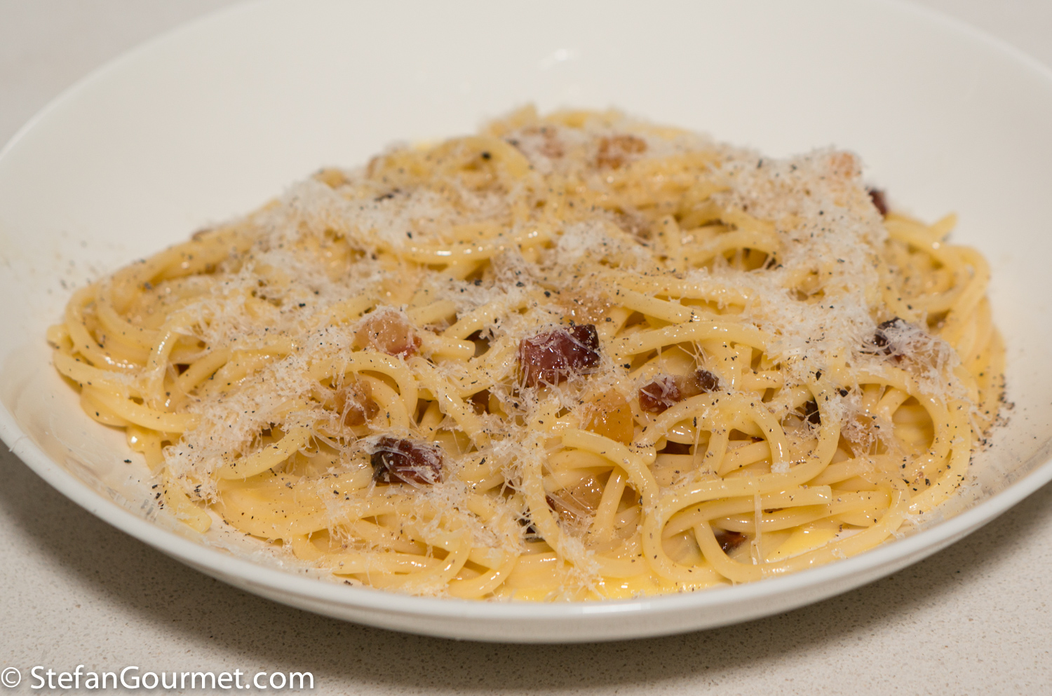 This is a traditional rendition of Spaghetti alla Carbonara. It is one of our favorite dishes that I make often because it is such great comfort food: filling and full of flavor. II use only the minimal ingredients (spaghetti, guanciale, eggs, pecorino, salt, black pepper) and ‘cook’ the eggs in the hot spaghetti in a serving bowl instead of in the pan.