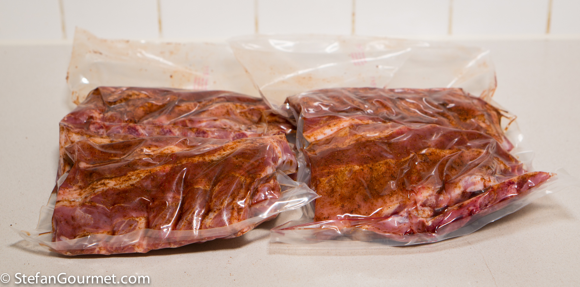 Allow the ribs to cool in the refrigerator and then vacuum seal them. Cook them sous-vide for 24 hours at 57C/135F.