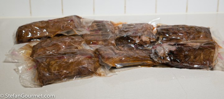 Allow them to marinate in the refrigerator overnight. I vacuum sealed them for this step because that way it is easier to put them in the refrigerator, but you could just put them on a dish and cover with plastic wrap.