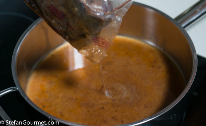 Afterwards, open the bags and collect all the smoky juices in a pan. There is a lot of great flavor in these juices from the meat and spices.