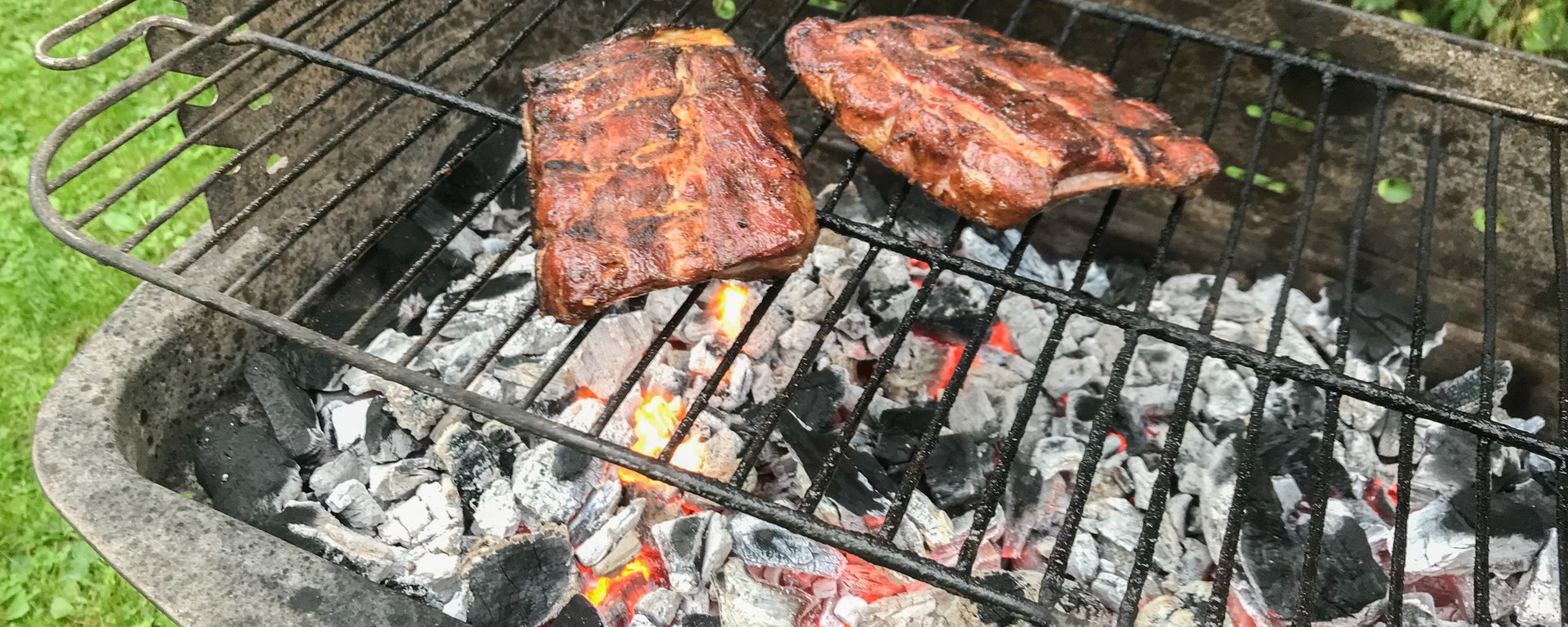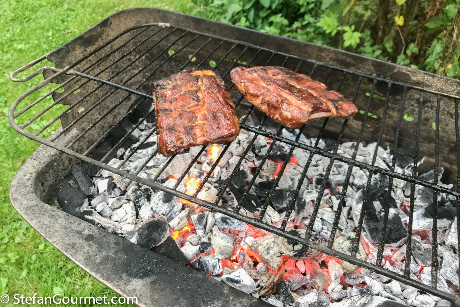 Everything up to here can be prepared in advance. To finish the ribs, cook them on a hot charcoal grill until they are nicely browned and heated through, turning them often (as otherwise they will burn before they are heated through). To maintain the juiciness, keep the core temperature below 57C/135F. Serve with the BBQ sauce.