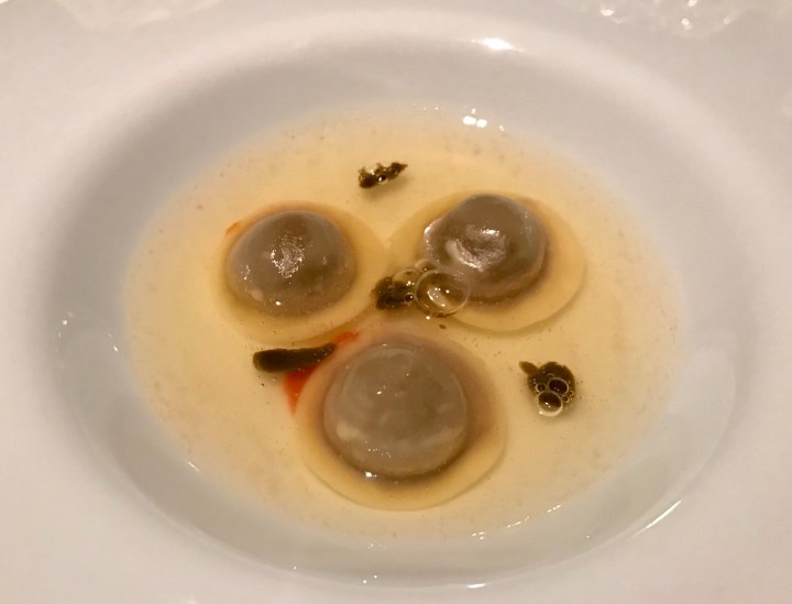 Next ravioli of smoked eggplant with tomato water. Those dark drops are made of basil. This was paired adequately with the silver label rose, also made from Gaglioppo but aged in oak. Unfortunately the wine was very young (2017) and therefore the oak was not integrated with the wine yet. 8/10