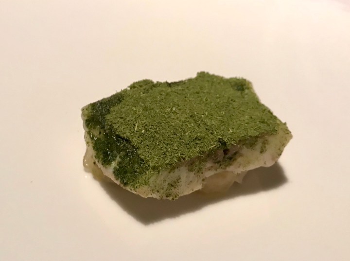 A San Marzano tomato, raw, peeled, with a sauce of green apple and lemon. The tomato was from the farm itself and very flavorful. I think I would have preferred it without the apple and lemon, but it was good. 7/10