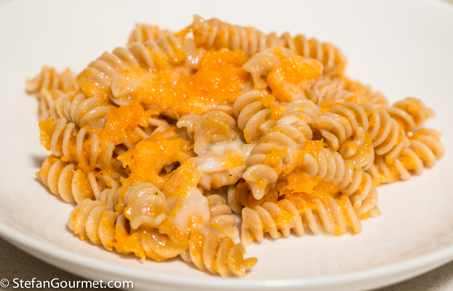 Pasta with butternut squash and gorgonzola. The sweetness of the pumpkin works very well with the pungent blue cheese.