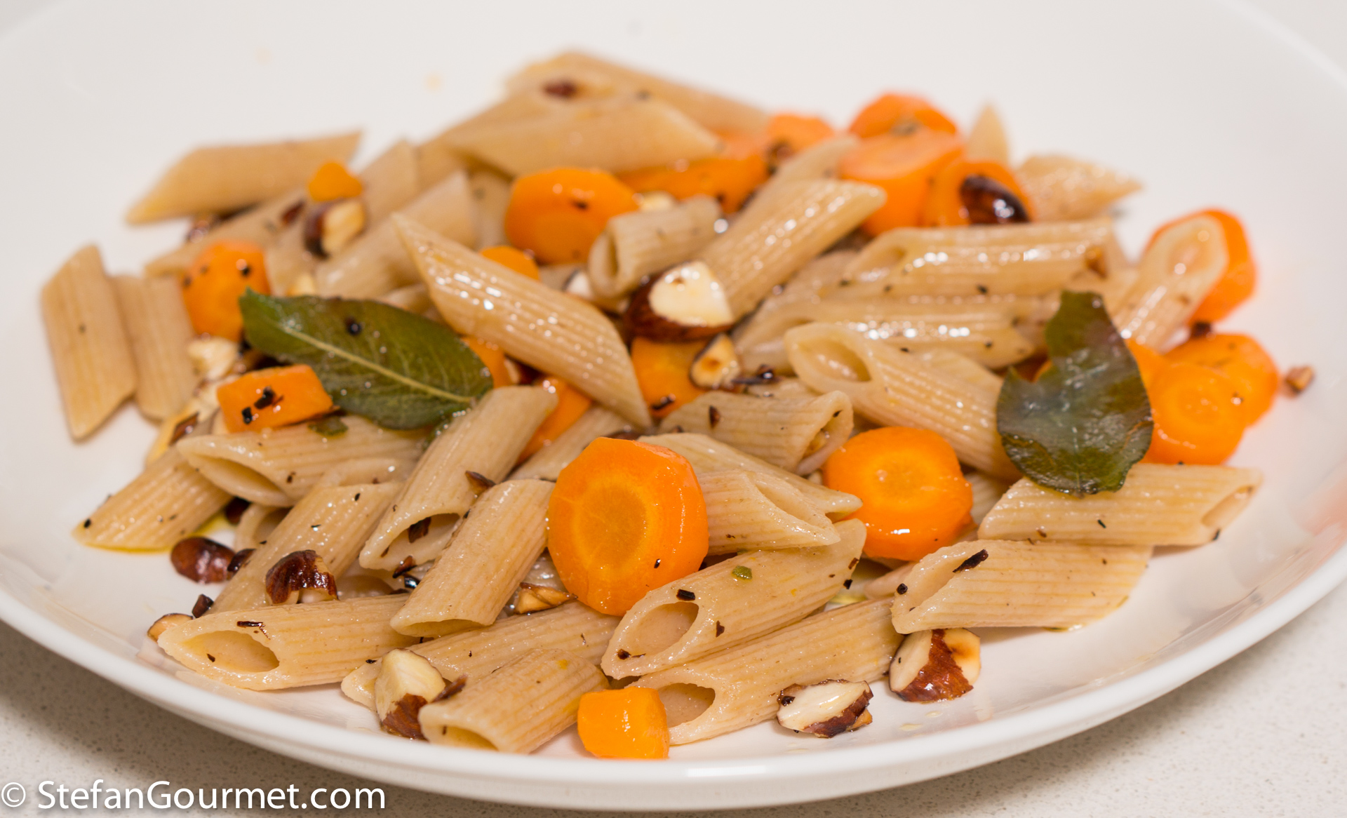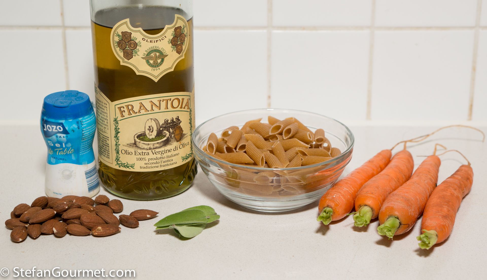 The combination of carrots and almonds is very nice, and the sage adds a nice touch. For a vegan dish this has a lot of flavor. This is a simple dish with a small amount of ingredients, that can be prepared in the time it takes to boil the pasta.