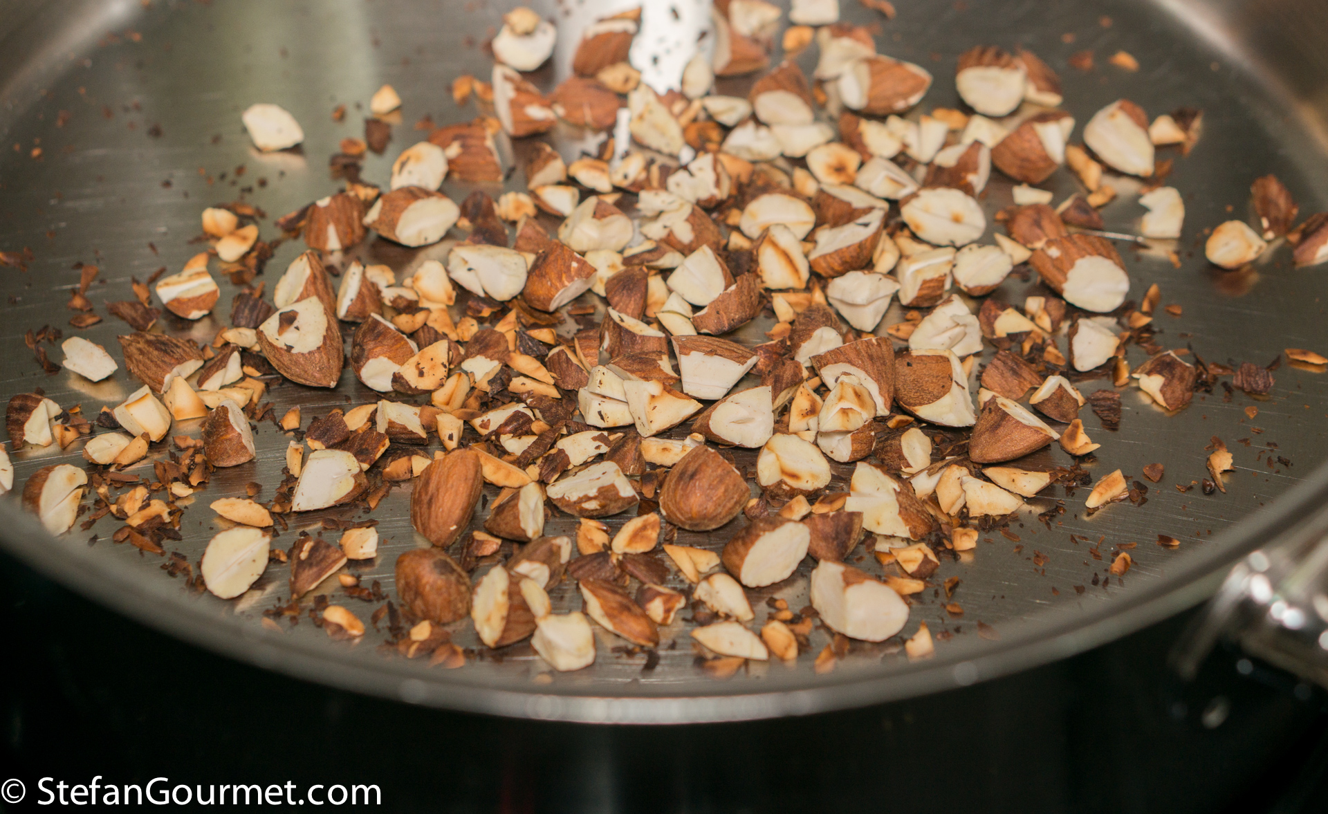 Chop the almonds coarsely and toast them briefly. They should be golden but not burnt. I did this in a pan as it was too hot to heat up the oven when I prepared this, but it is a lot easier to do it in the oven (8 to 10 minutes at 180C/350F). Toasting the almonds is the main change I made to Paola’s recipe. It gives more flavor to the almonds, which may be more necessary for me as the almonds are not as good as the ones you can get in Italy.