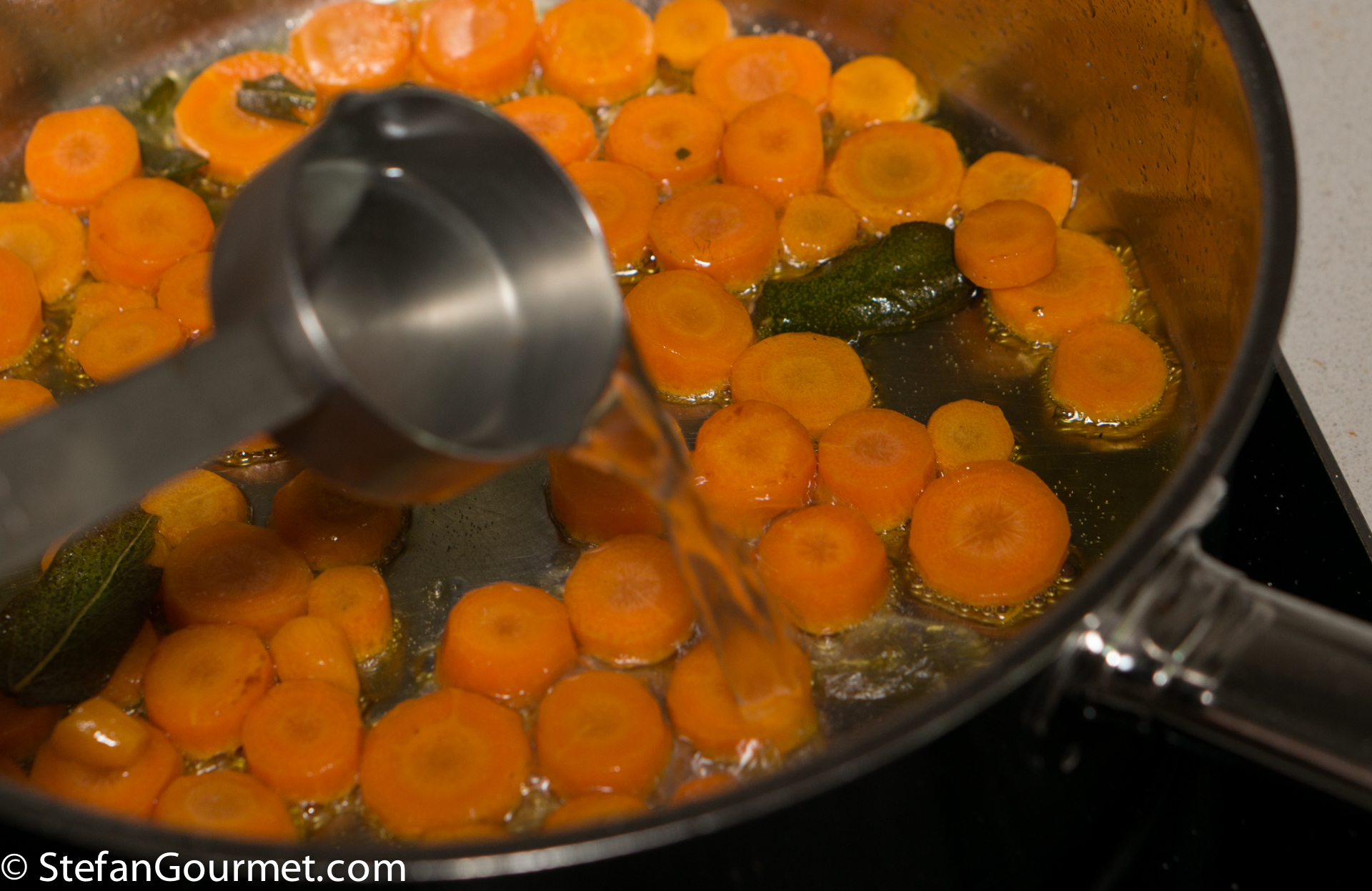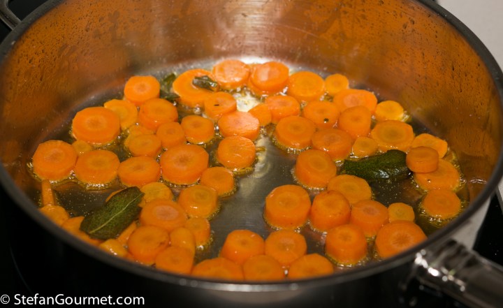 Heat 2 tablespoons olive oil in a frying pan and add the sliced carrots and sage leaves. Stir over high heat until carrots and sage are coated with the oil. Then season with salt and turn down the heat…