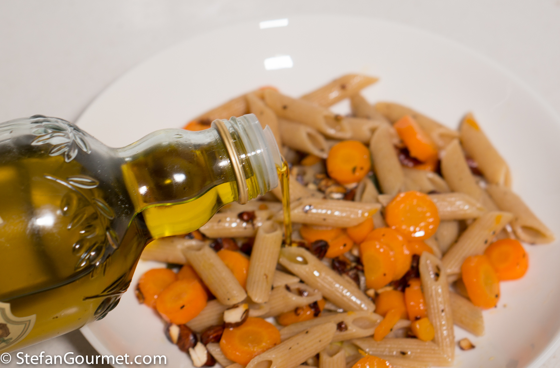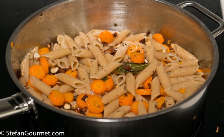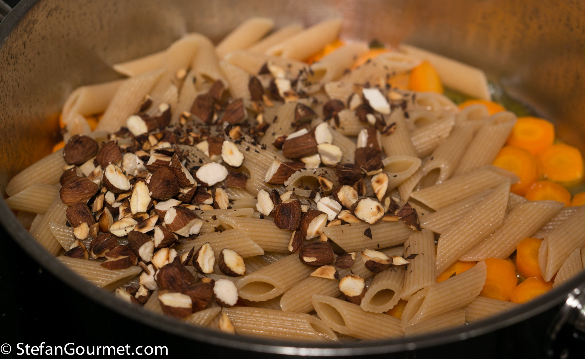 Drain the pasta and add to the carrots. Add the toasted almonds as well.