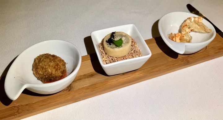 Three types of seafood carpaccio including prawn and swordfish with various garnishes. The garnishes were all very tasty, but perhaps a bit too many of them.
