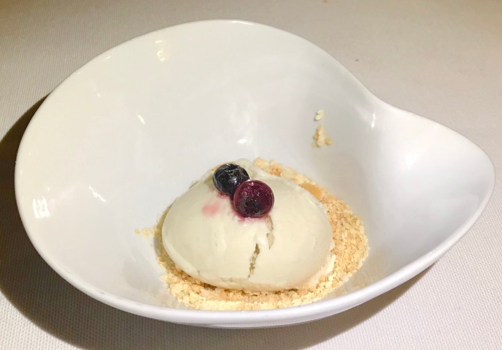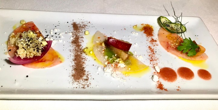 The first course of the tasting menu looked more like what would be called amuses bouches (small appetizers) at other restaurants. The crispy eggplant and mint ball with a bit of gazpacho was very good. There was also a tiny eggplant quiche and a cod cracker with cruschi mayonaise (cruschi is a type of pepper). The quiche was a replacement for a zucchini blossom stuffed with ricotta, because unfortunately the season for zucchini blossoms is ending.