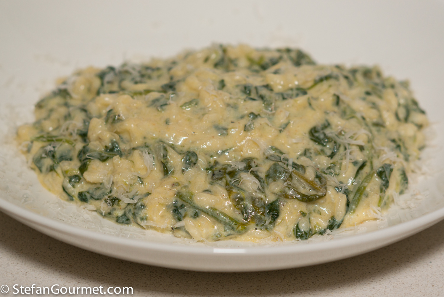 Spinach and ricotta are a classic combination in Italian cuisine, probably known best as one of the most common fillings for ravioli. But it is also a great combination to make risotto. The resulting risotto is very creamy from the ricotta and the spinach is not as ‘in your face’ as a spinach only risotto.