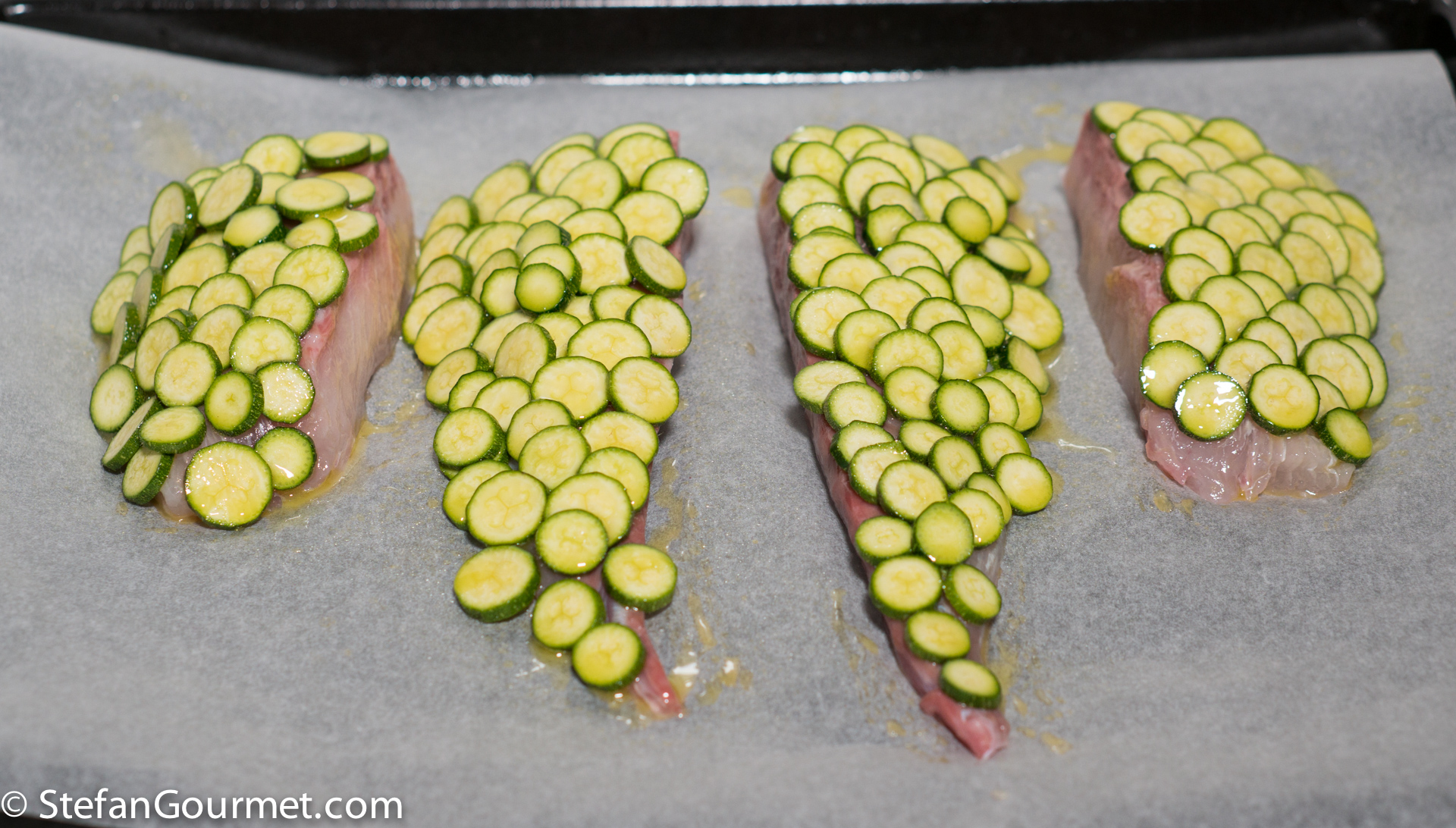 I brushed the fish with beaten egg so the zucchini would stick better. I am not sure that it actually worked. As mentioned in the introduction, it is probably easier with zucchini slices that are slightly larger.