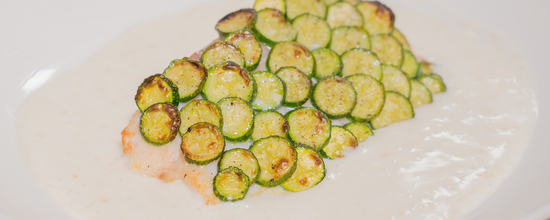 Season the zucchini with salt and freshly ground black pepper before carefully transferring the fish with zucchini to preheated plates. Then spoon the cheese sauce around the fish and serve.