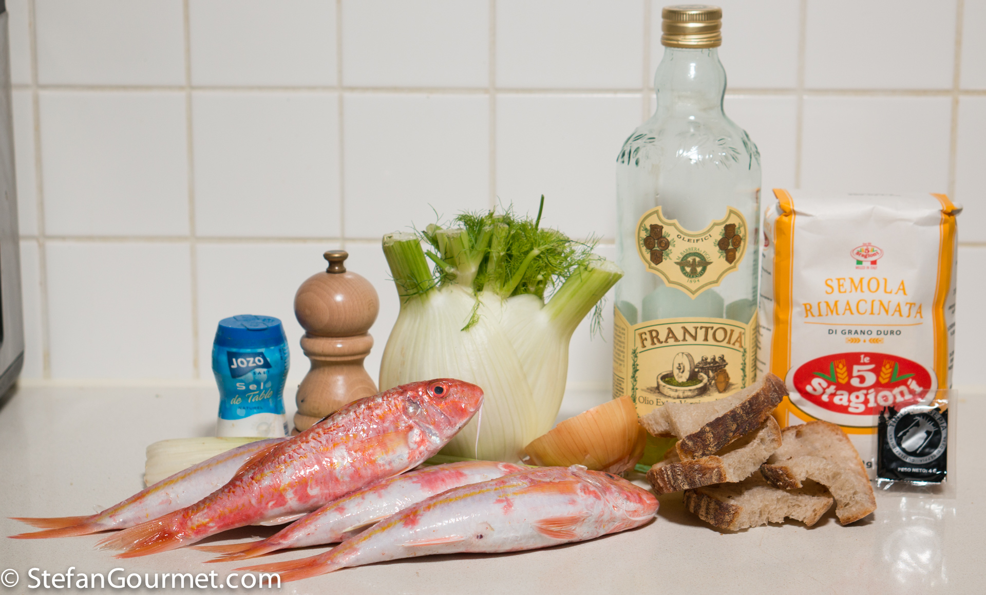Meanwhile, fillet the red mullet or ask your fish monger to do it. Reserve the fillets for now. You should end up with 400 grams (14 oz) of fillets. Use the heads and bones to make fish stock with the onion, celery, and trimmings from the fennel. Instructions for making fish stock are here.